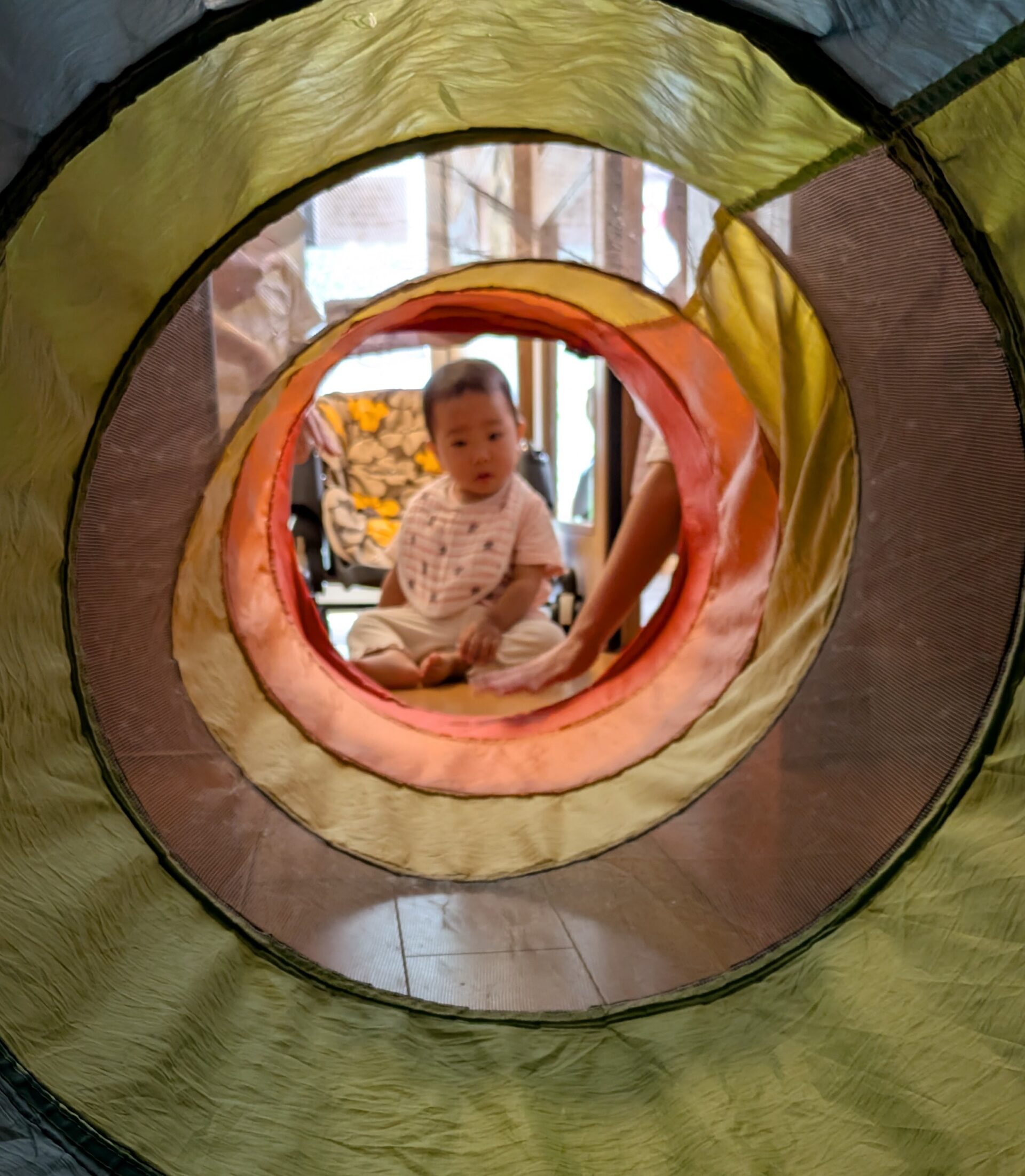 さあトンネルを通ってスタート!薄暗~いお部屋に、ちょっとタジタジな様子💦