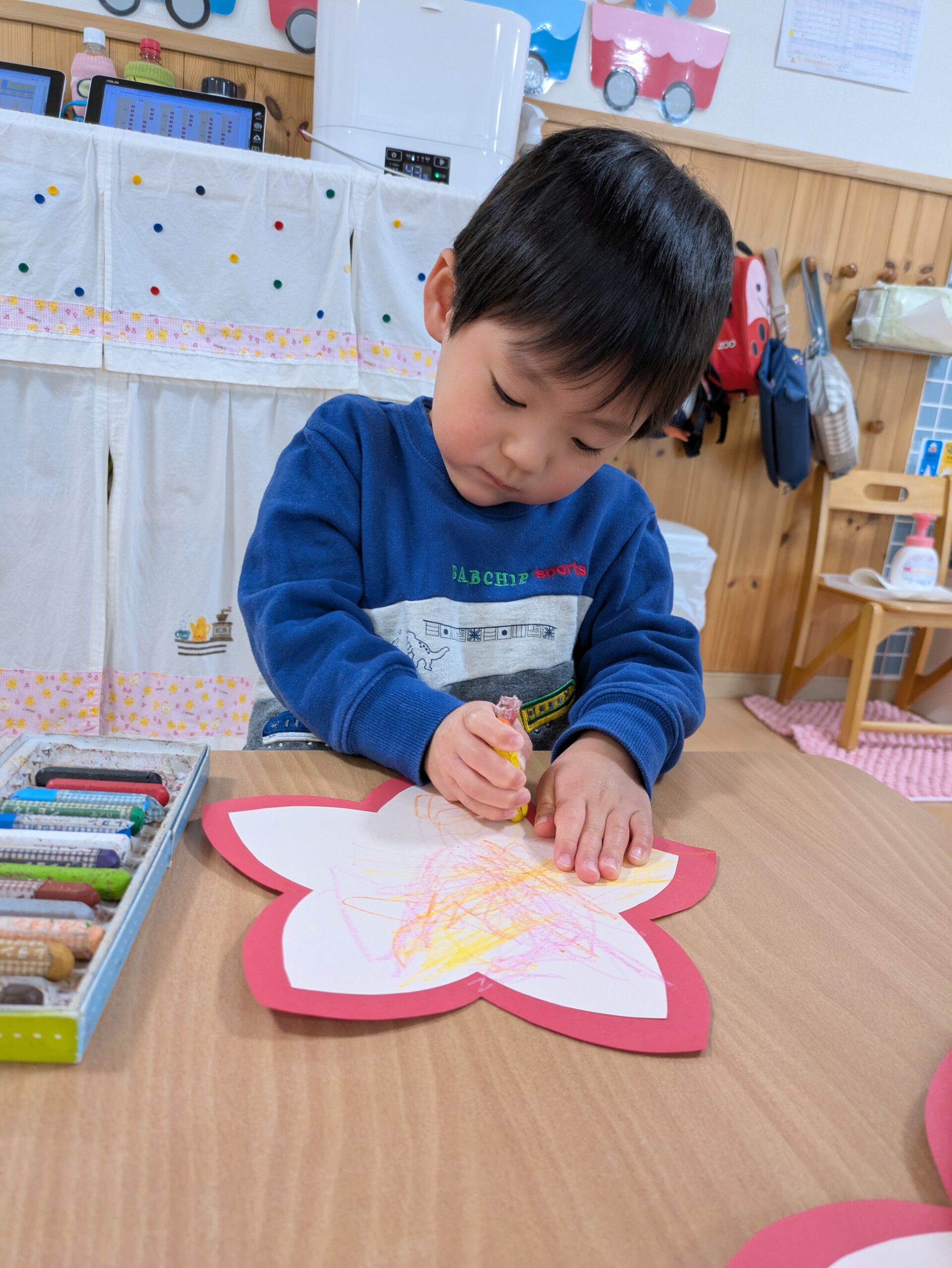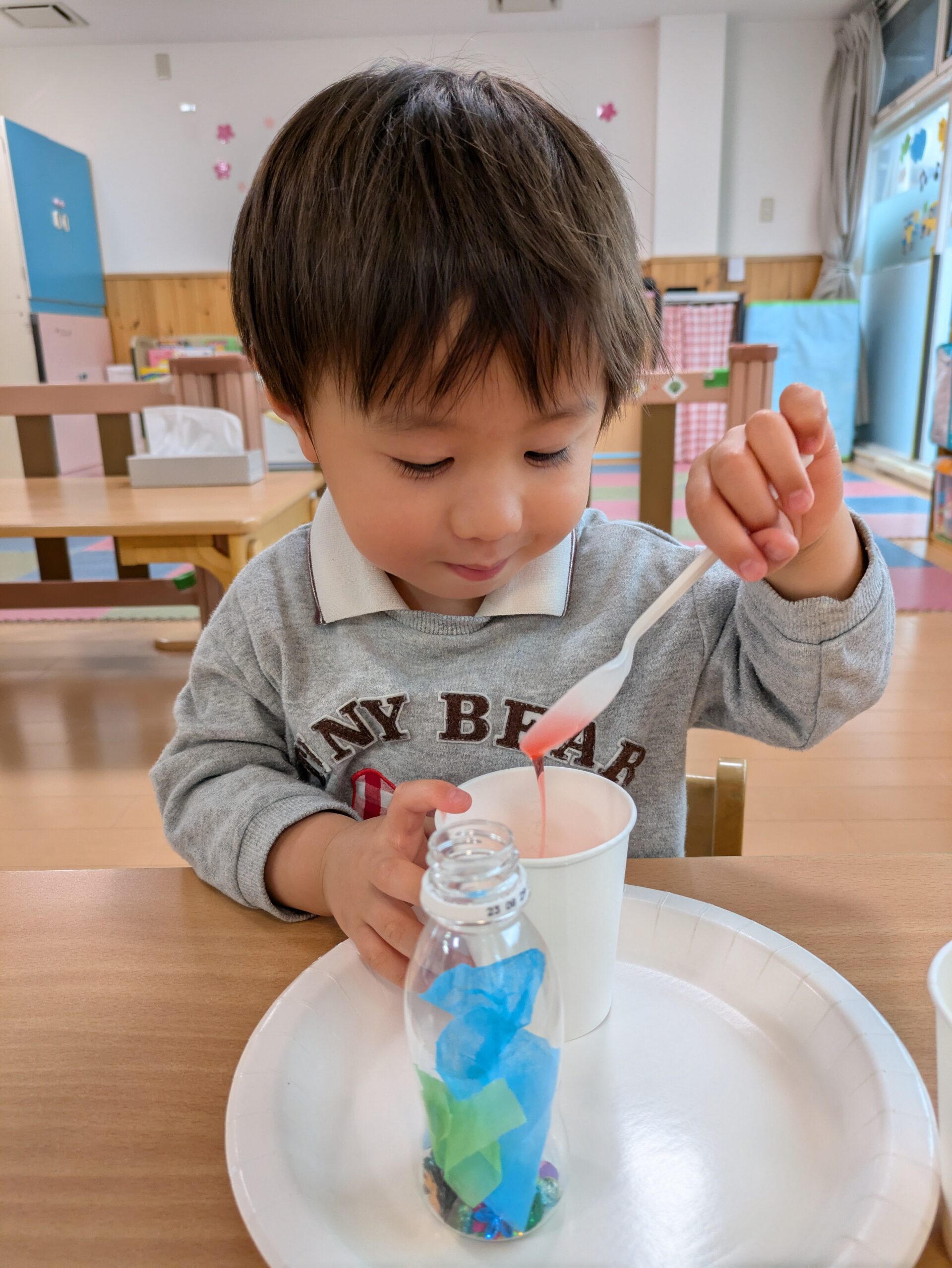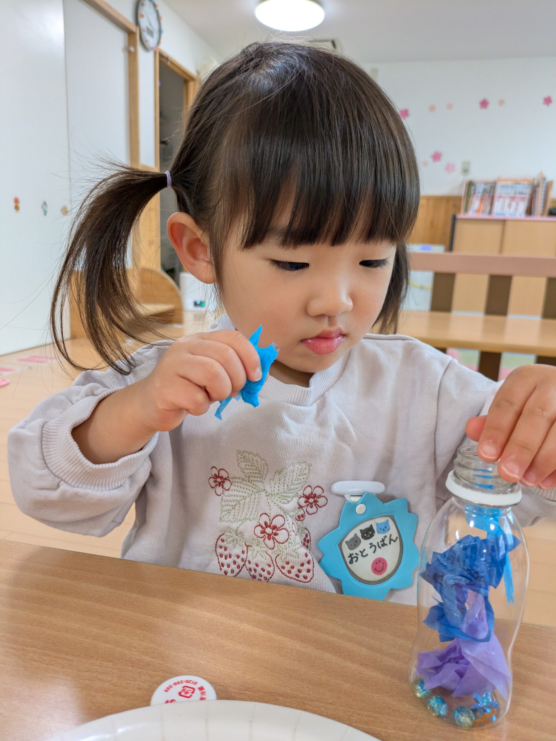 クレヨンで模様を描いたり、シールを貼ったり、小さなスパンコールやビーズを落とさないようにそーっとペットボトルに入れたり、お花紙を千切ったりと最後まで集中して取り組んでいましたよ。
