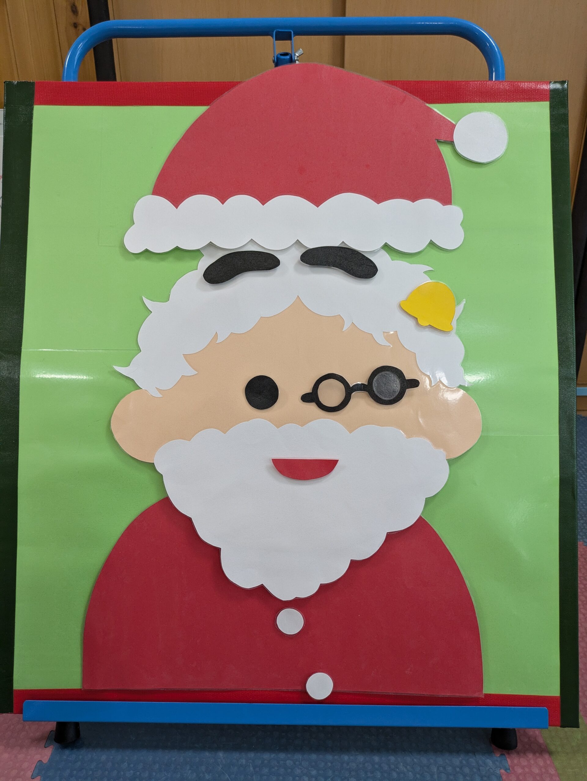 思い思いに顔のパーツを貼って、おもしろサンタさん(?)が完成です。ベルを頭に貼った時は、サンタさんも真似っこをして鈴を鳴らしてくれました。