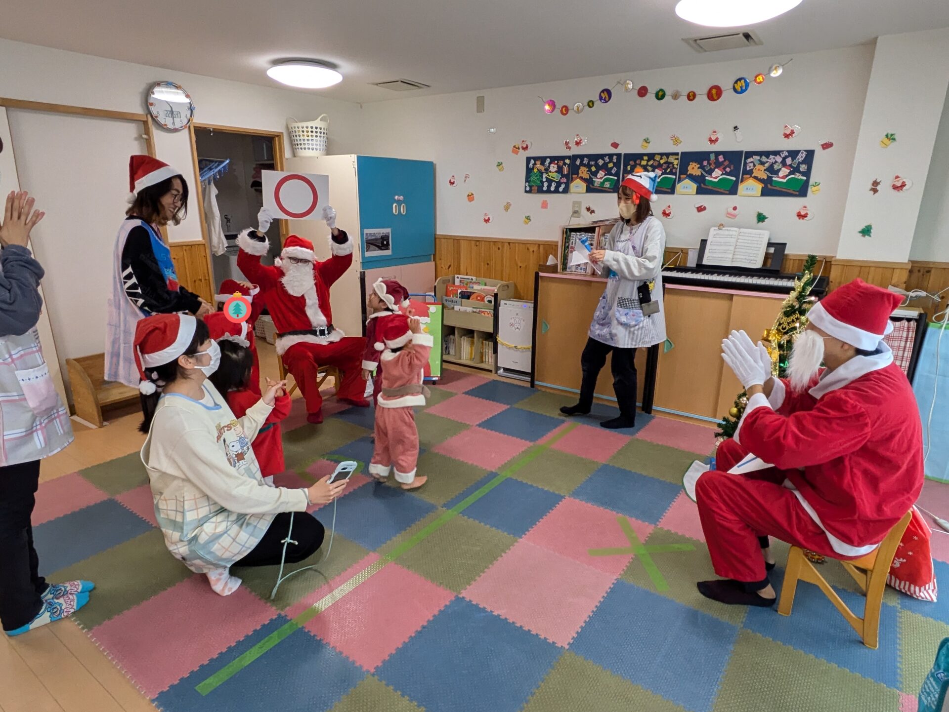 泣いたり緊張した姿もありましたが、一緒にお楽しみを見たりゲームに参加することでサンタさんと打ち解けていく子どもたち。おててタッチや握手をしたり、一緒にジャンプをしたり…とても楽しんでいましたよ。