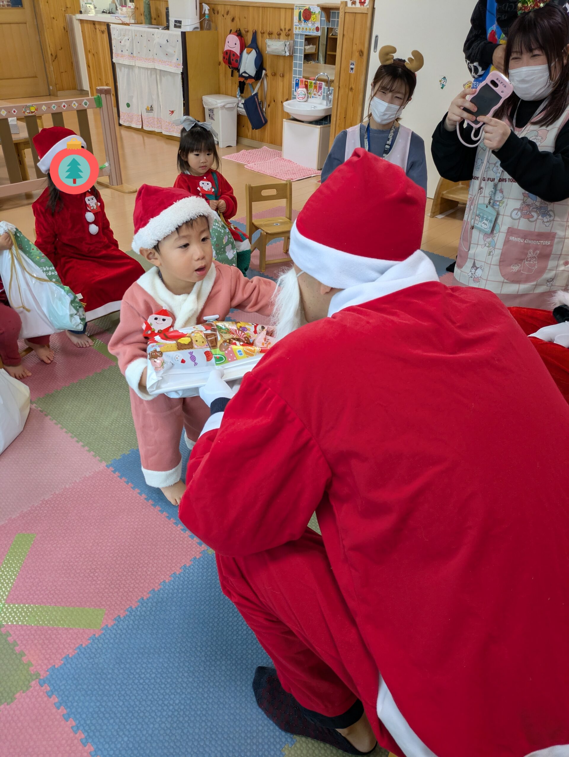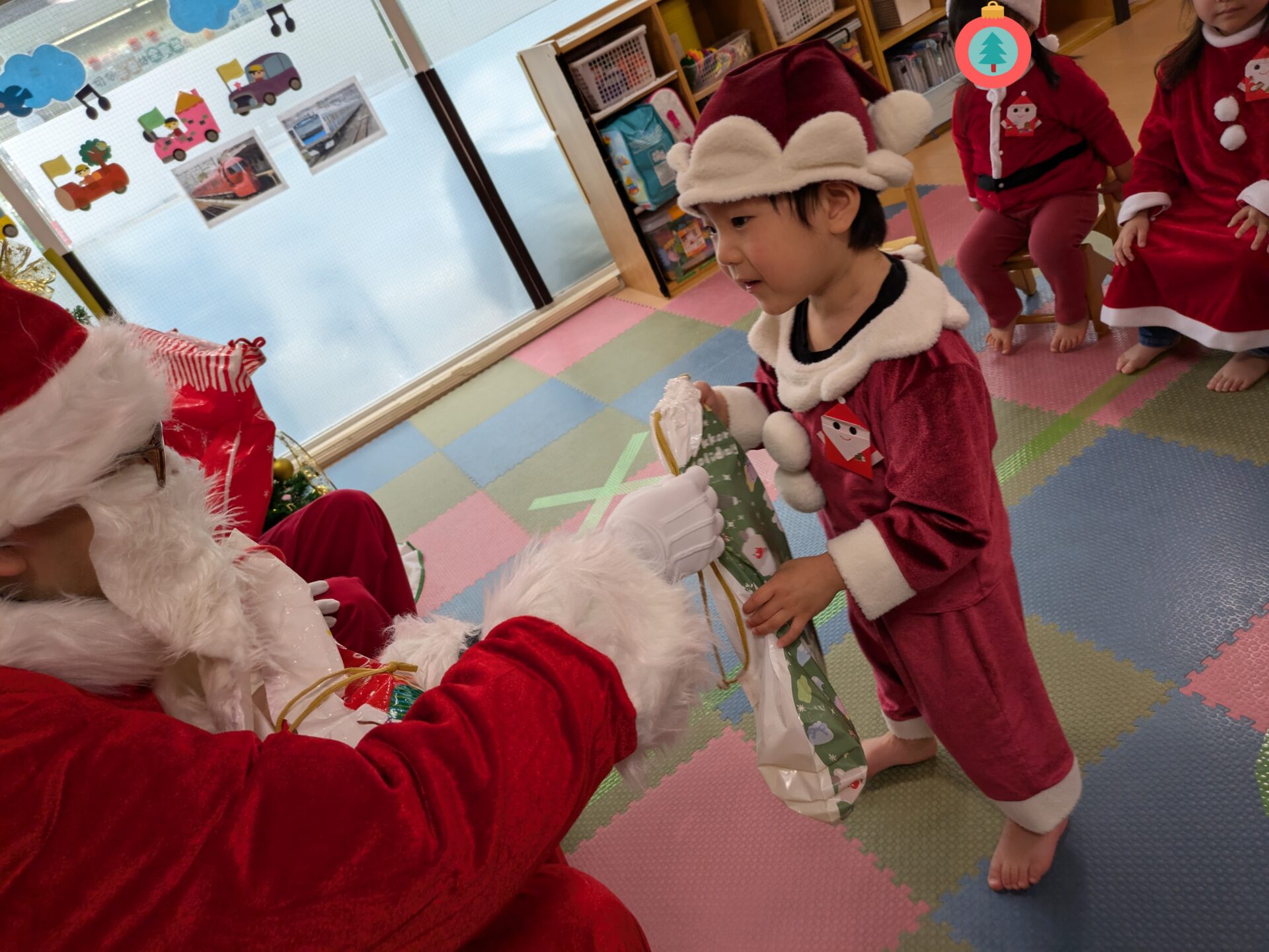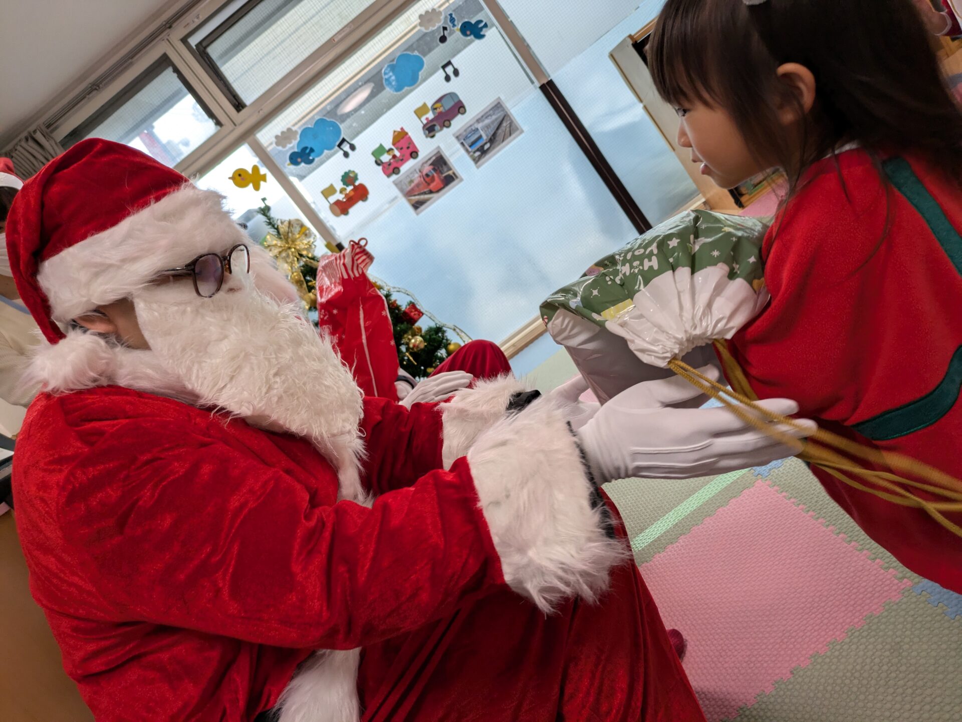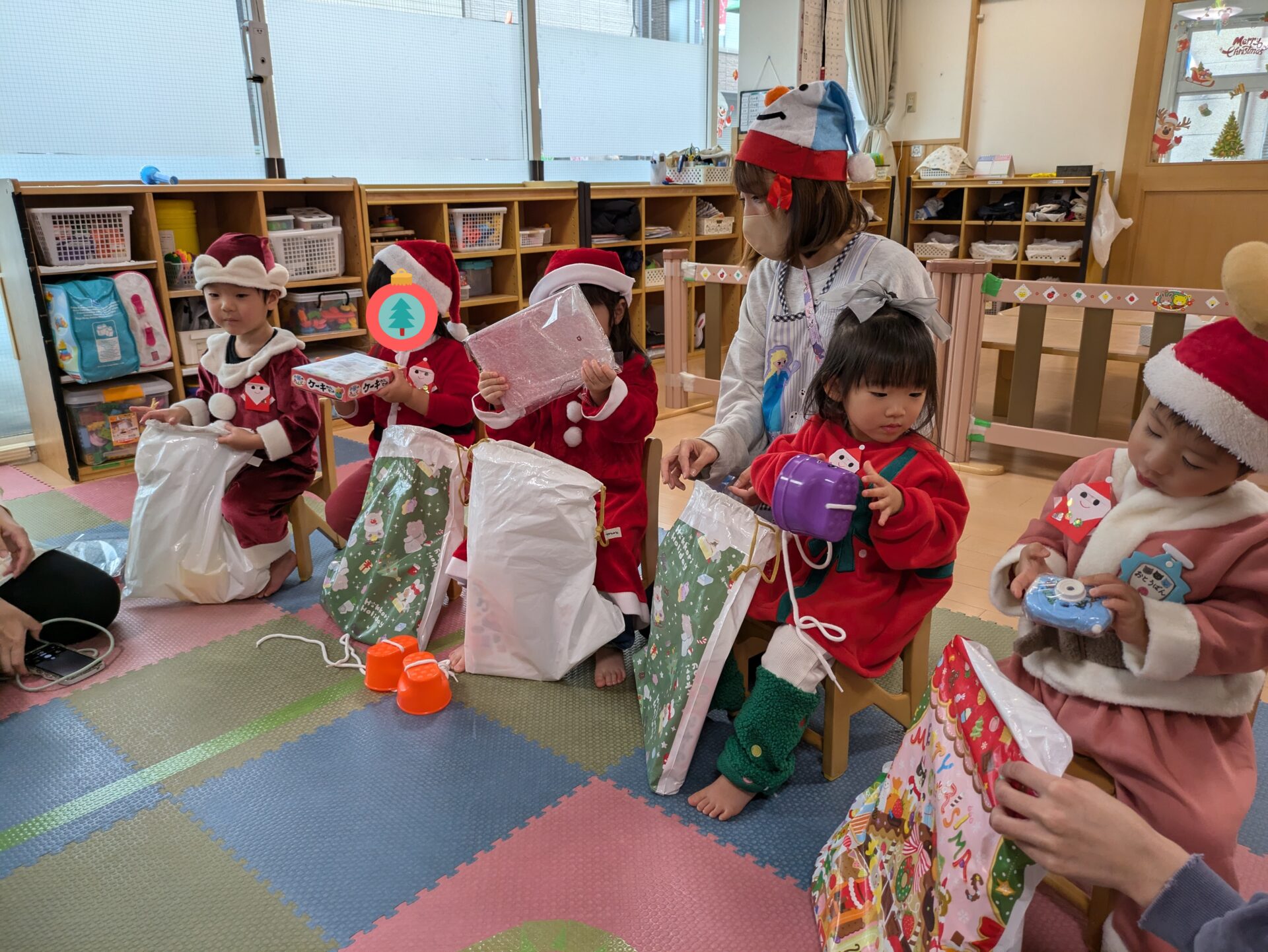サンタさんは遊びに来ただけでなく、子どもたちにクリスマスプレゼントも用意してくれました。プレゼントを受け取ると嬉しそうに袋の中身を見ていましたよ。