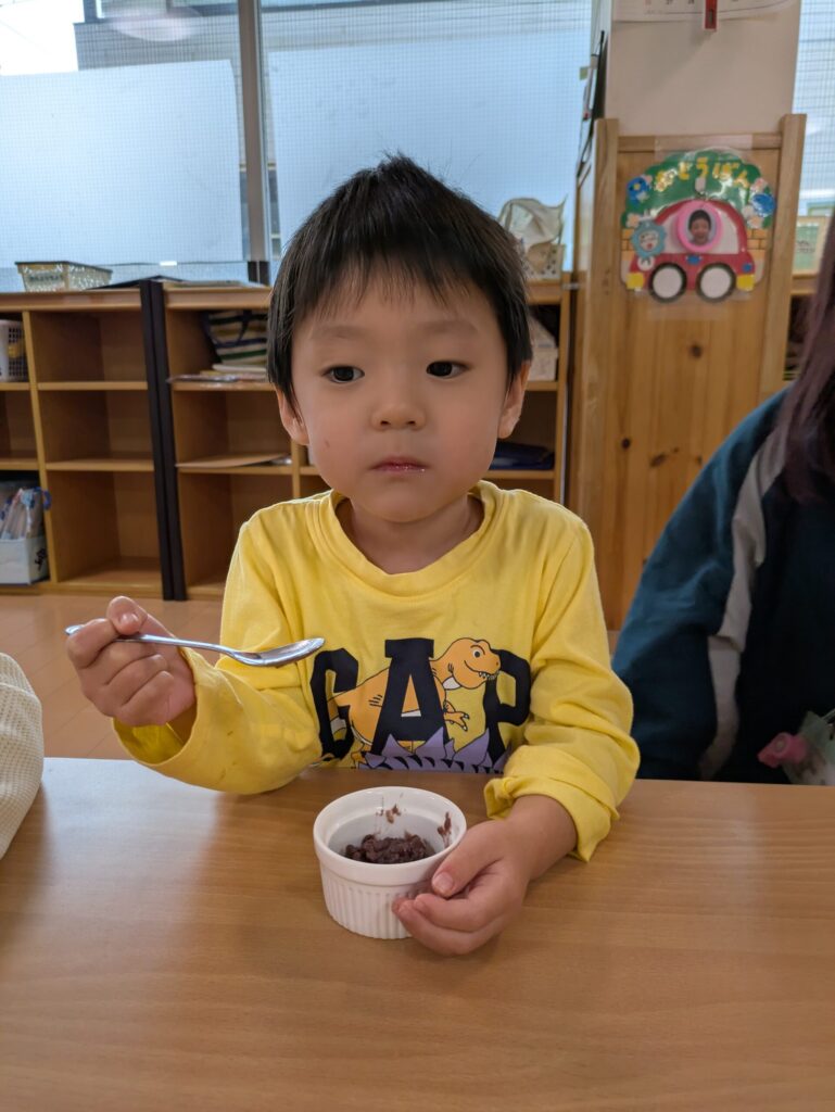 食育当日は前半に『小豆レース』、おやつの時間に『どら焼きづくり』を行いました♪