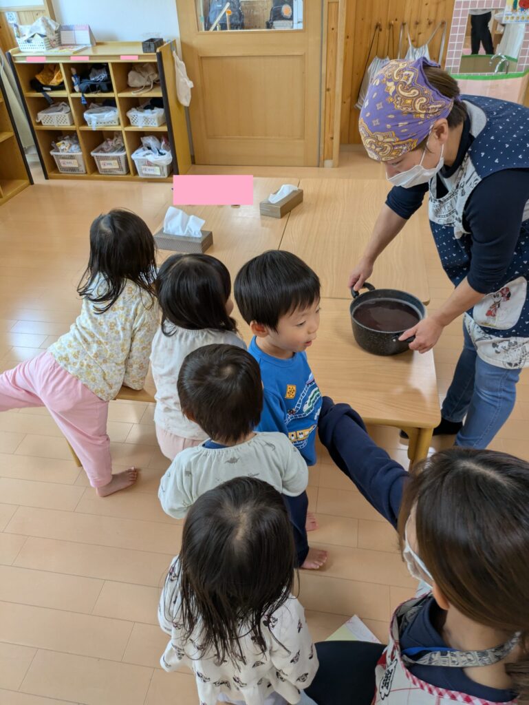 お昼寝前の子どもたちにあんこ作りの過程を見てもらい、「お昼寝から起きたら甘ーいあんこになっているから、みんな食べようね」と約束をしました♪