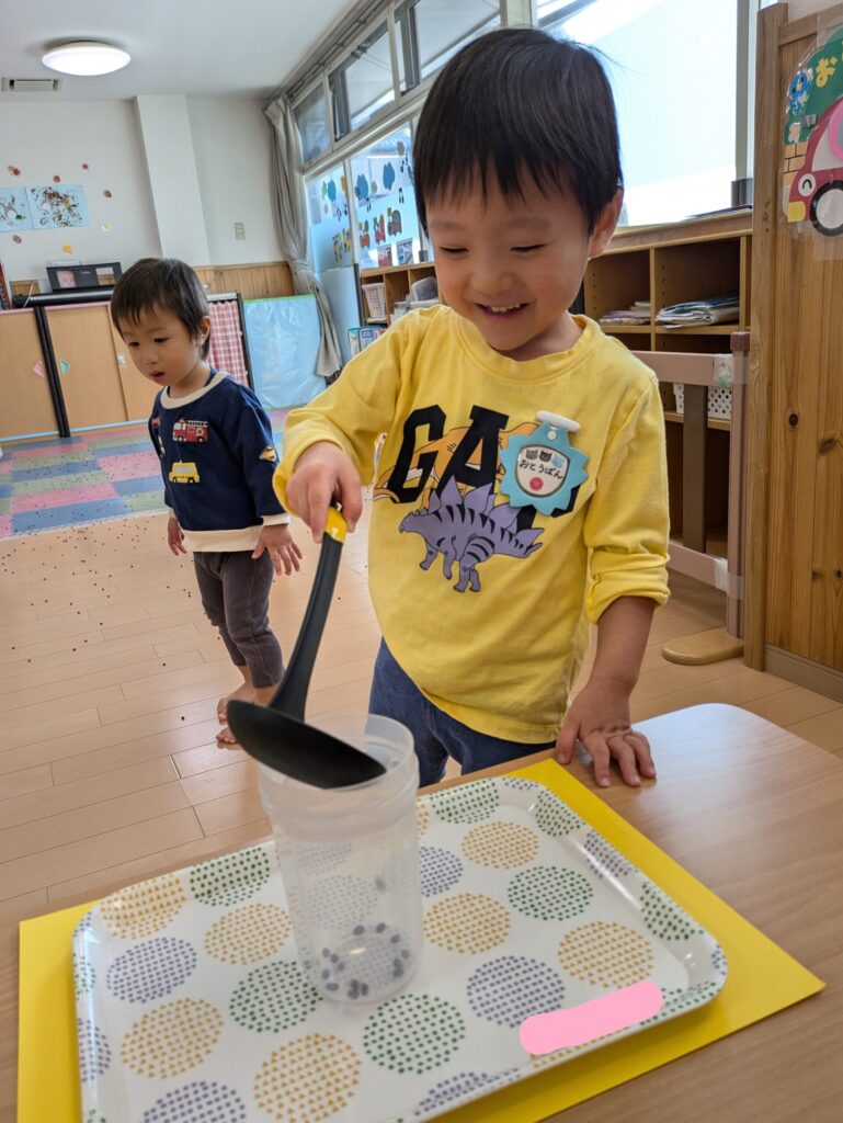 「もう一回やる!!」とめげずに挑戦する子どもたち☆回数を重ねるごとにコツをつかみ、容器にどんどん小豆が溜まっていきました(*^-^*)