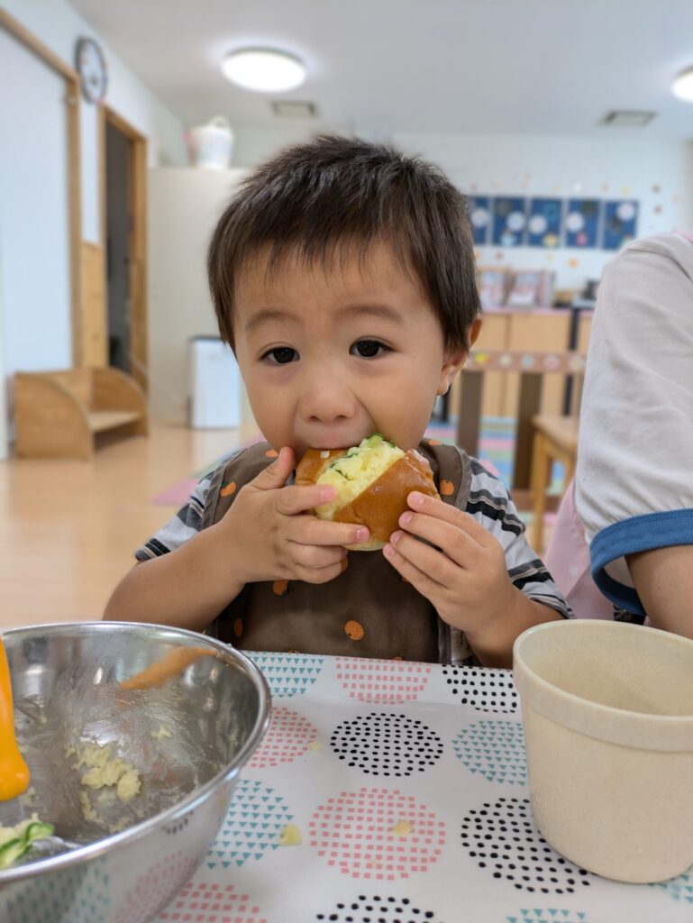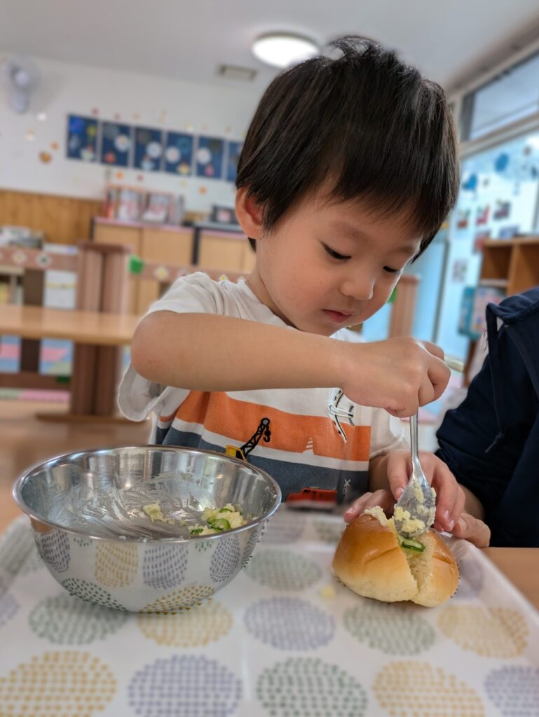 左手でロールパンを広げて、右手でポテトサラダをつめました♪慣れない作業に苦戦しながらも、美味しいサンドイッチを作るために真剣に作業する子どもたちでした✨