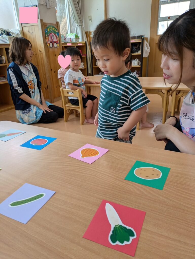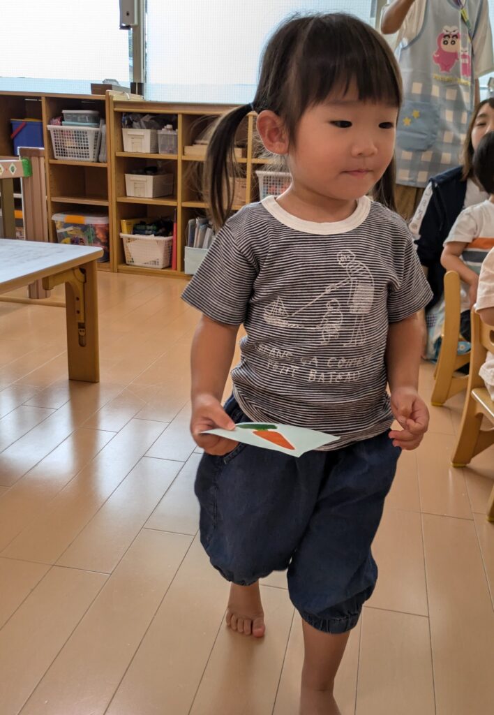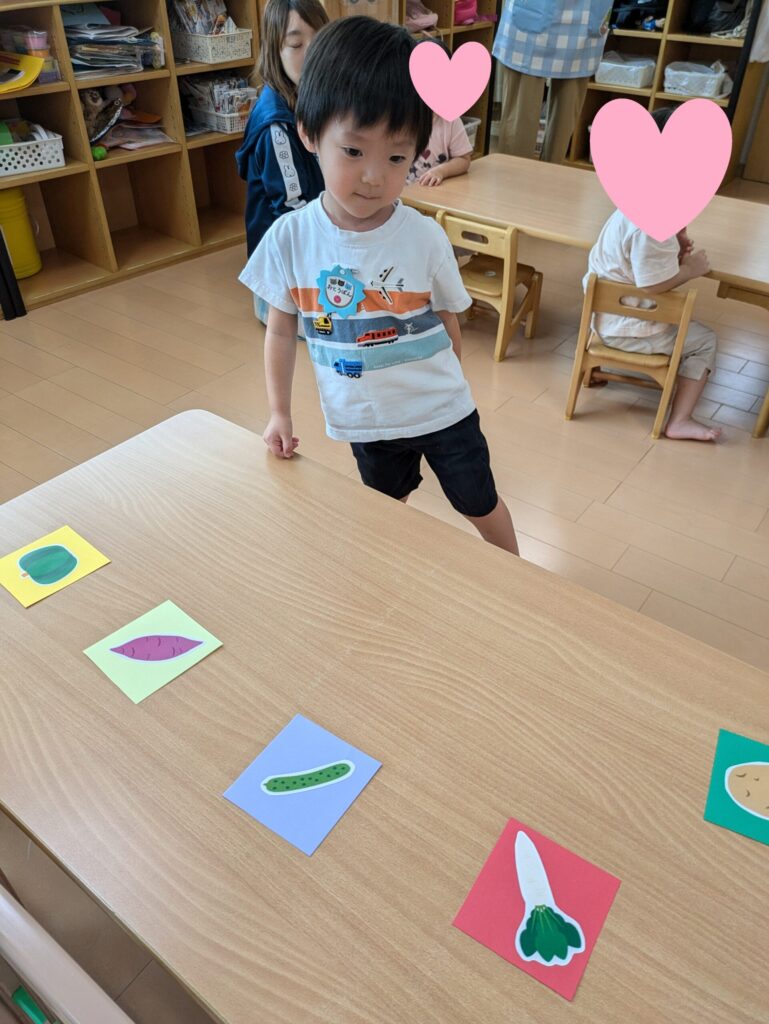 答えが分かったら手を挙げて、後ろに置いてある正解だと思う野菜カードを取り、先生の所まで持って行きました☆