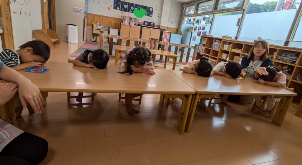 『野菜を食べた音から何の野菜か当てるクイズ』は、子どもたちに机に伏せてもらい、先生が食べている野菜の音を聞いて、何の野菜を食べたか当ててもらいました☆