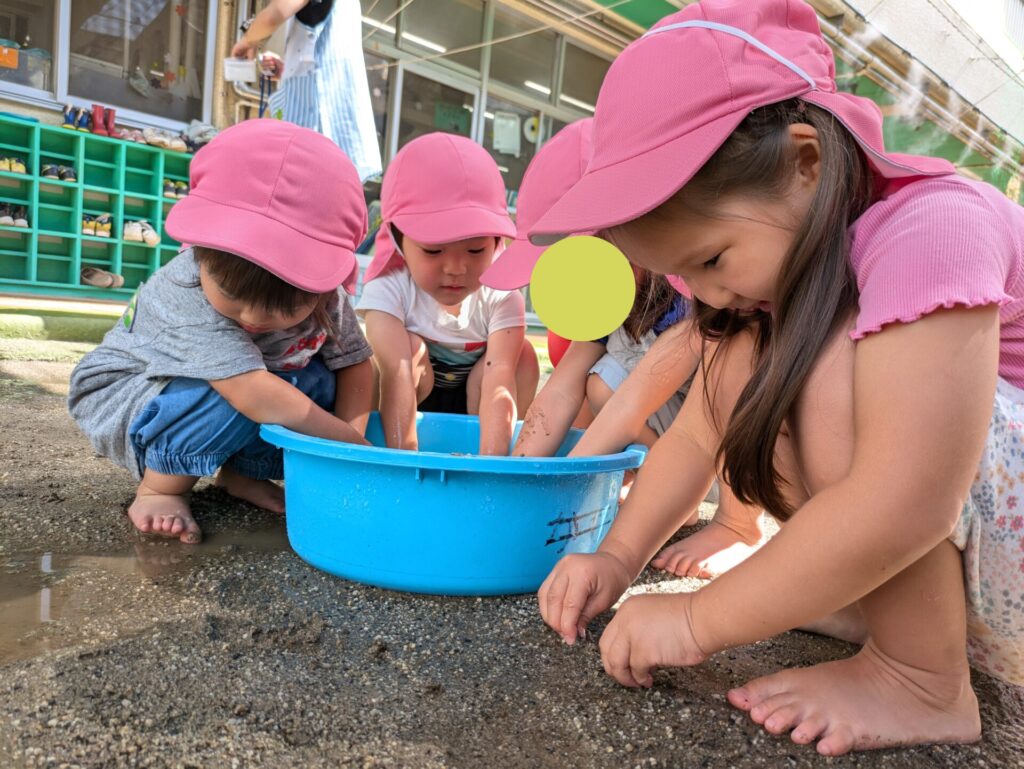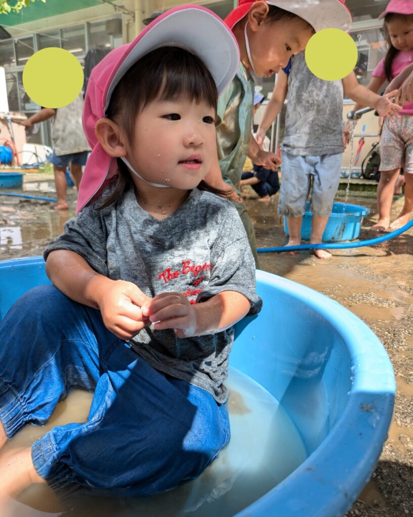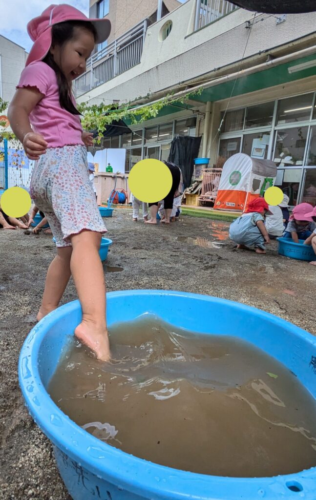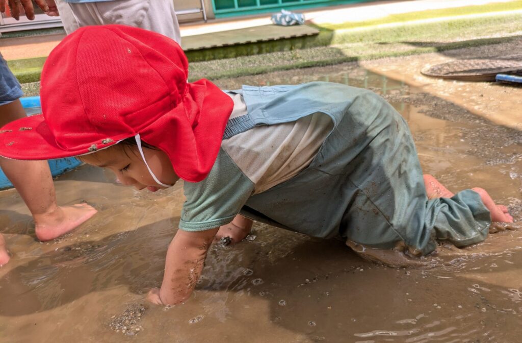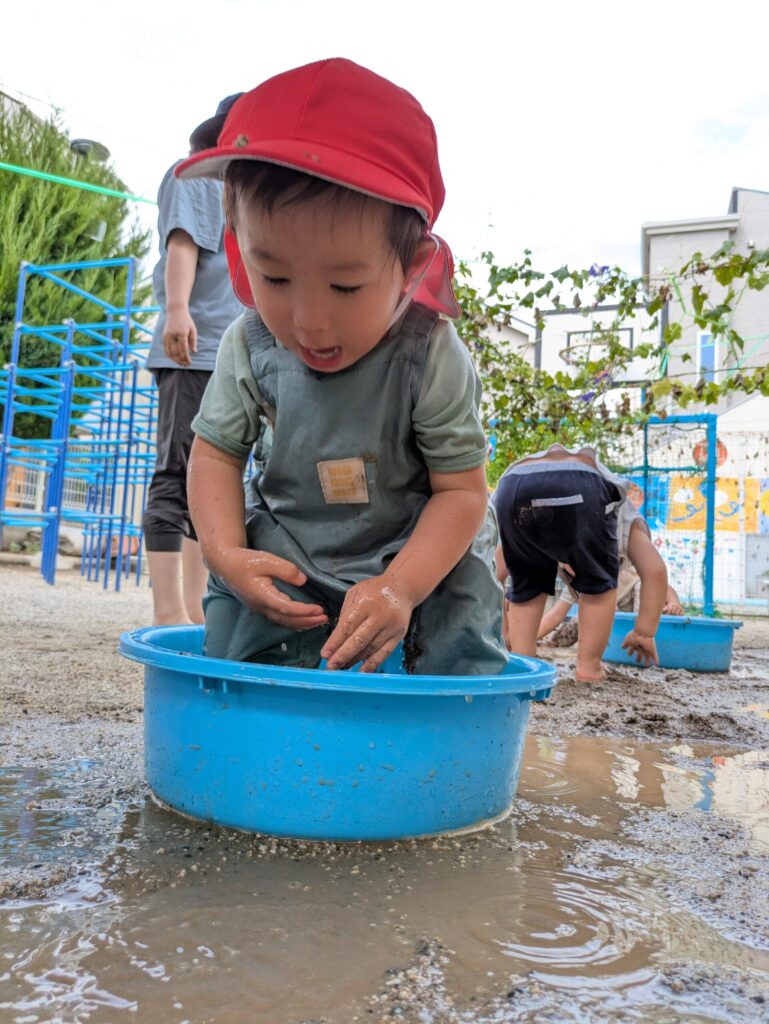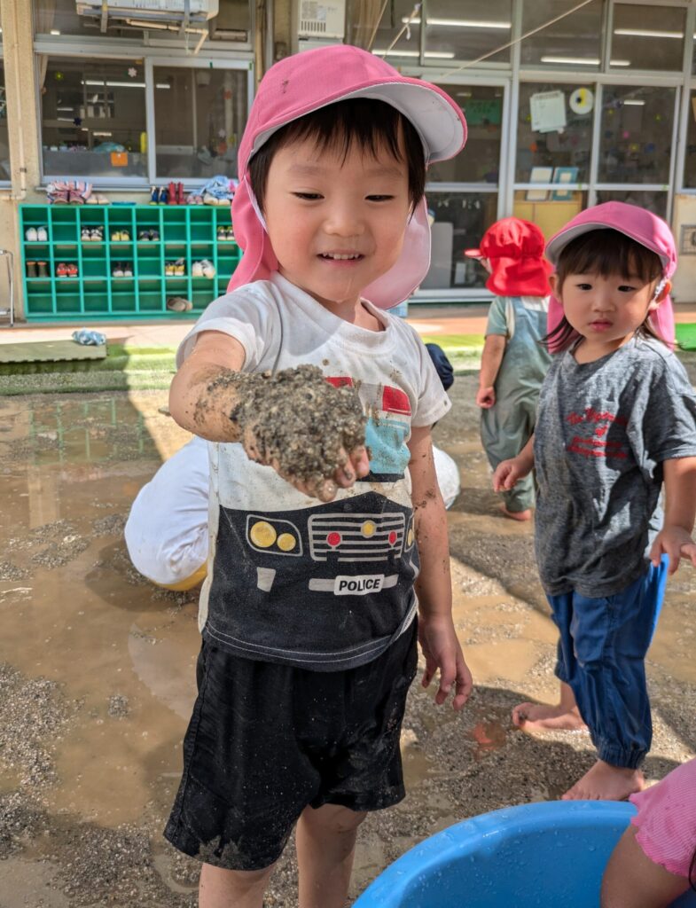 9/11(木)に南長崎第二保育園へ行き、泥遊びを体験しました。最初は砂利の上をそ~っと慎重に歩き、水が入っているタライの中に手を入れて「きもちいねぇ」と言っていた子どもたち。 少しずつ慣れてくると、タライの中に両手で鷲掴みした砂を入れて素敵な泥水完成‼お風呂や足湯に見立てて嬉しそうな表情でその中に入っていました。 その他にも、泥をにぎにぎして泥団子を作ったり、ブルドーザーのようにして両手で水が流れる線路を作ったりなど、全身で思う存分泥遊びを楽しみました。 たくさん遊び尽くして疲れちゃったようで、帰り道に保育者が「いっぱい泥遊びしたね」など話しかけても、「・・・。」園に戻ってから給食をモリモリ食べ、お昼寝で布団に横になるとすぐ夢の中でした。