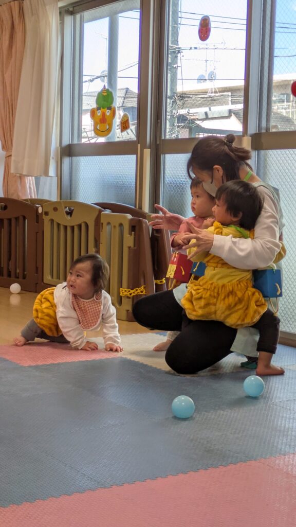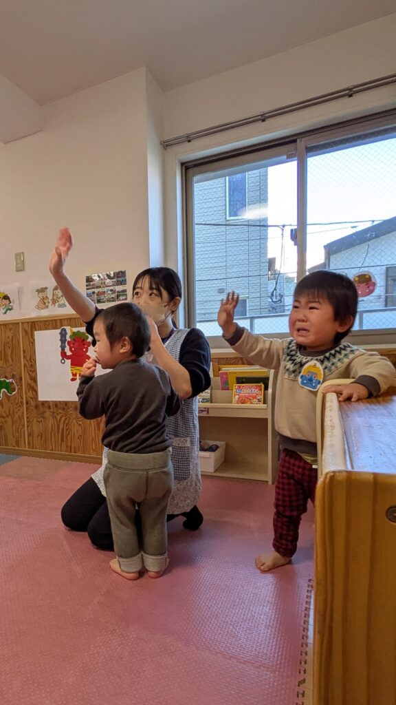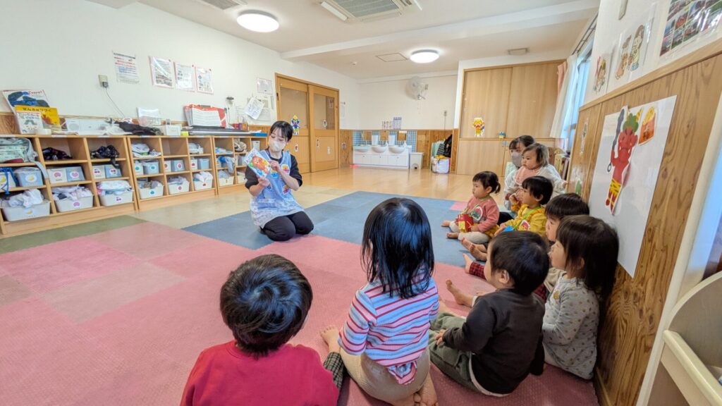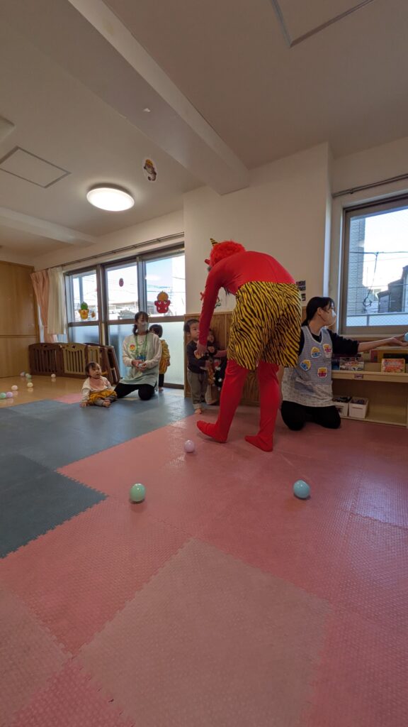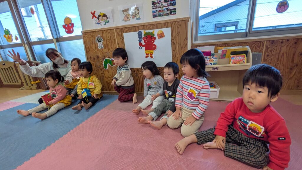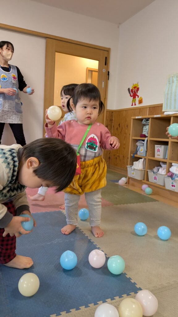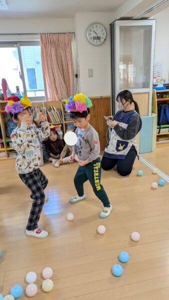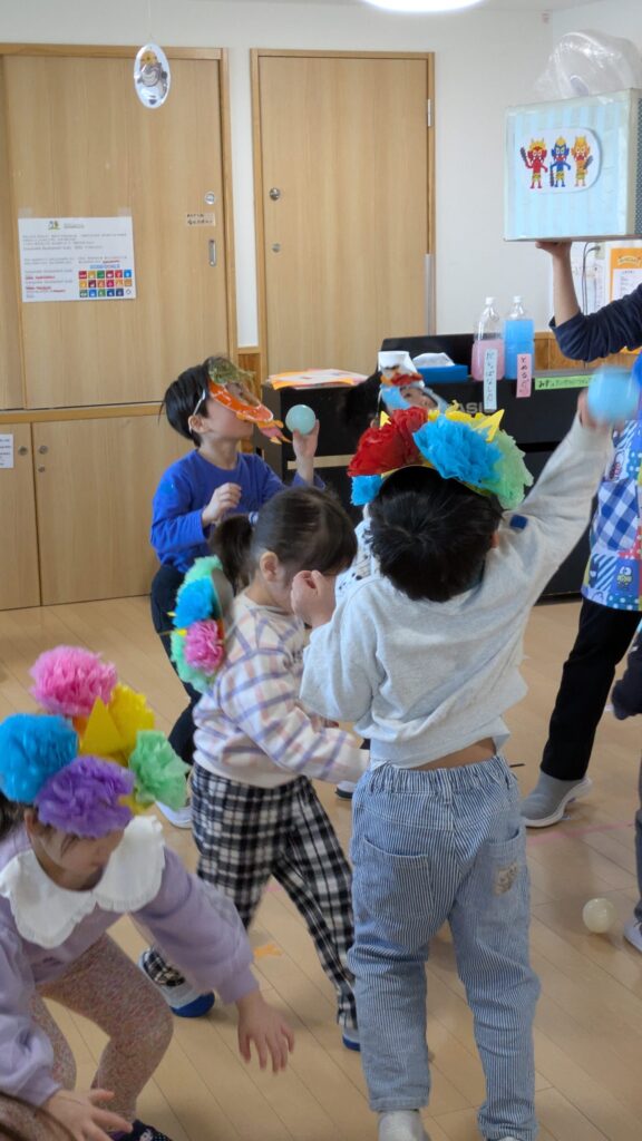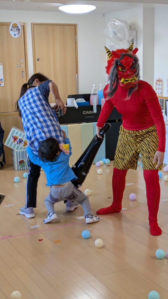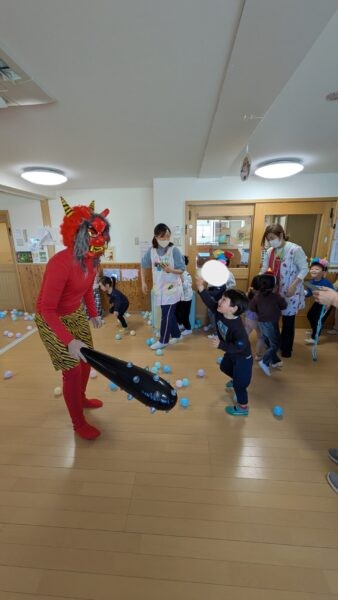 2月3日に節分会がありました。朝から「鬼は~外!福は~内!!」と準備万端な様子で掛け声の練習をする子も・・・! 0歳児から1歳児は絵本でお話を聞いた後は鬼のイラストにボールで豆まきごっこ。0歳児クラスのお友だちは鬼のパンツも履いて気合十分!!力強く「えいっ」とボールを投げていました。 豆まきごっこを楽しんでいると、なんと鬼が登場・・・。かたまる子もいる中、果敢に挑む子も!鬼もその勢いに負けたのかすぐに去っていきました!! 2歳児から5歳児クラスはみんなで玉入れ競争を行いました。2チームに分けての対戦は大盛り上がりでした(^^)♪各クラス自前の鬼のお面も色とりどり、個性豊かでとっても素敵でした♪ 盛り上がっている所に、こちらも鬼の襲来・・・始めは頑張って投げていましたが、鬼が近づくと、迫力に、圧倒される子どもたち。部屋の隅や保育者の陰に固まり、鬼の後ろ姿にボールを投げるのが精一杯な様子でした。 何とか闘い、みんなで無事に退治することが出来ました!