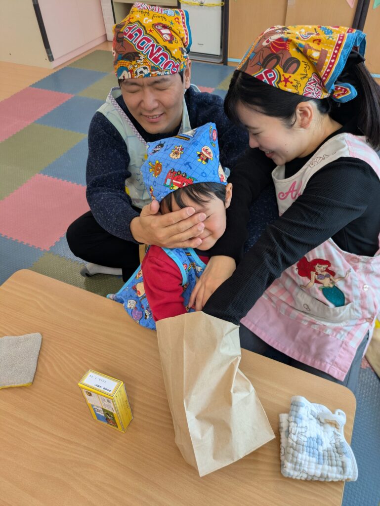 次は触覚クイズです。袋の中に入っている野菜は何か手触りだけで当ててもらいました。家族みんなで考えている姿が印象的でした!正解するととても嬉しそうでした。