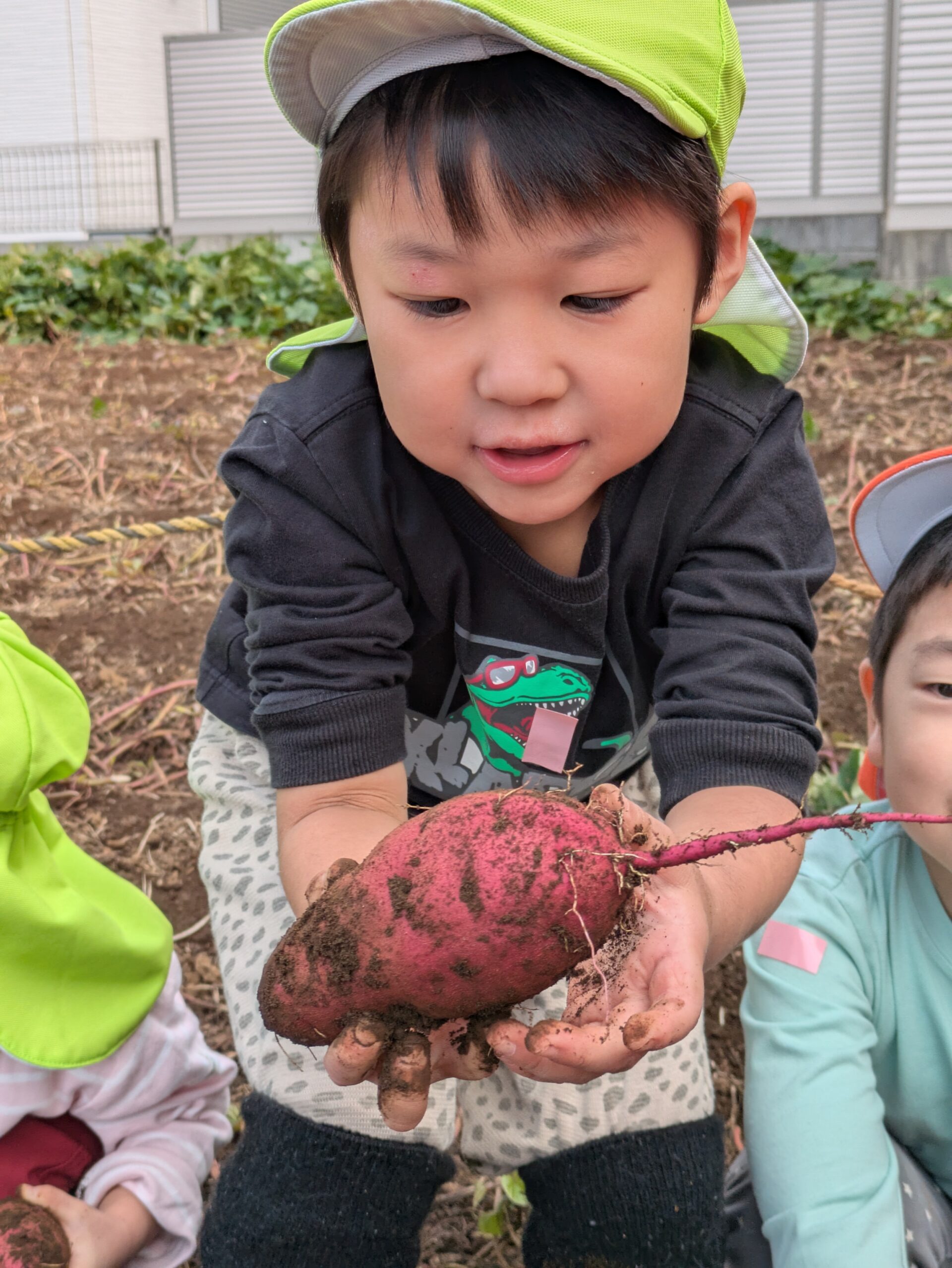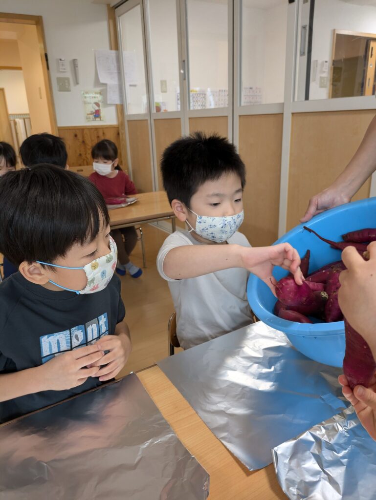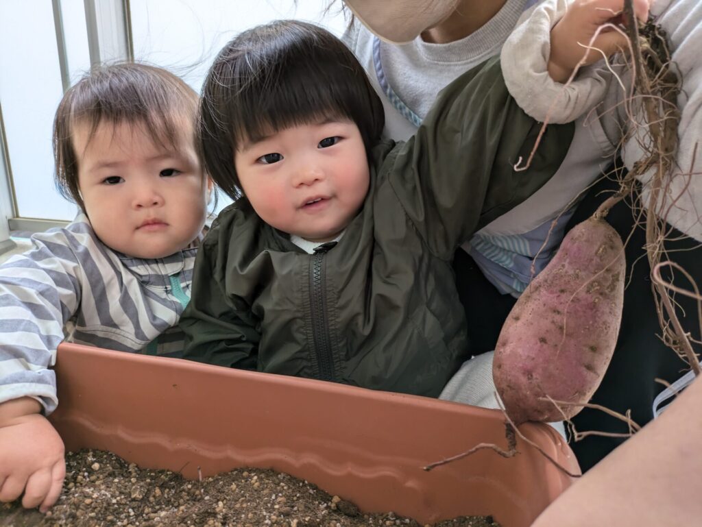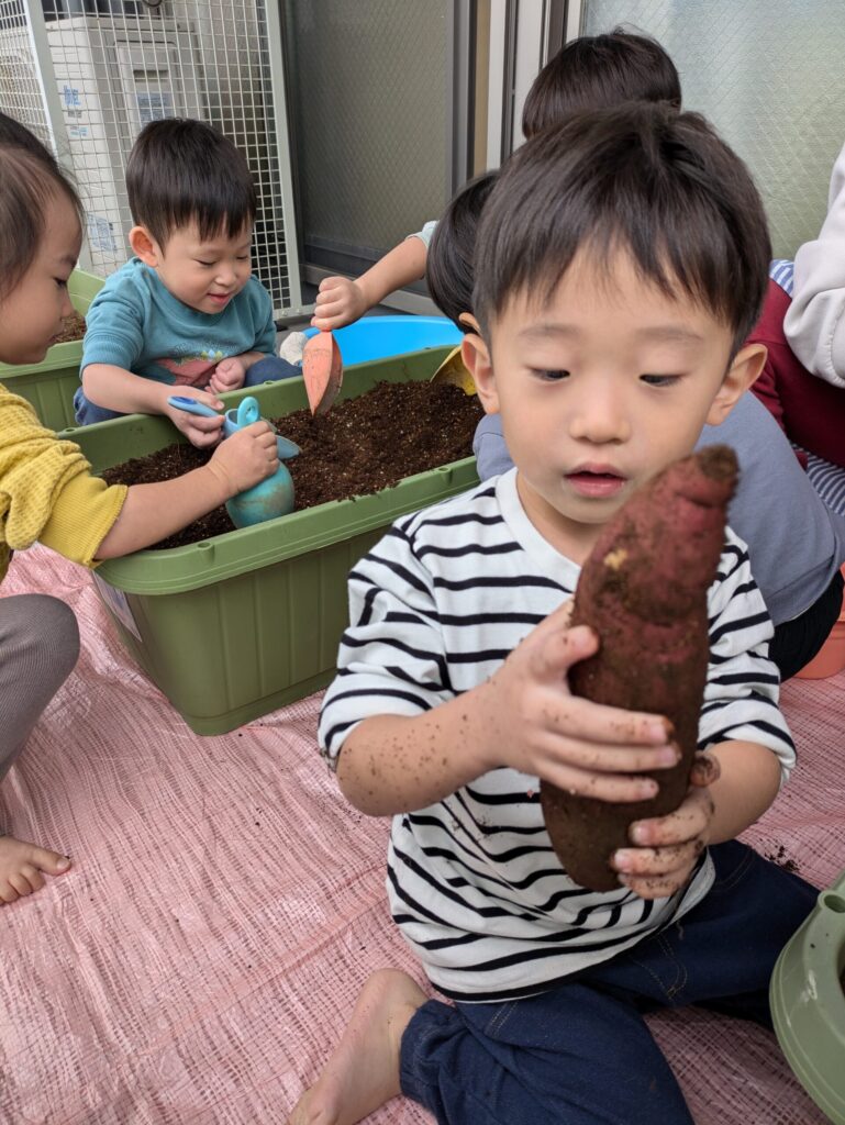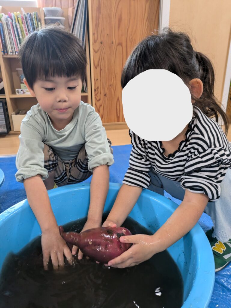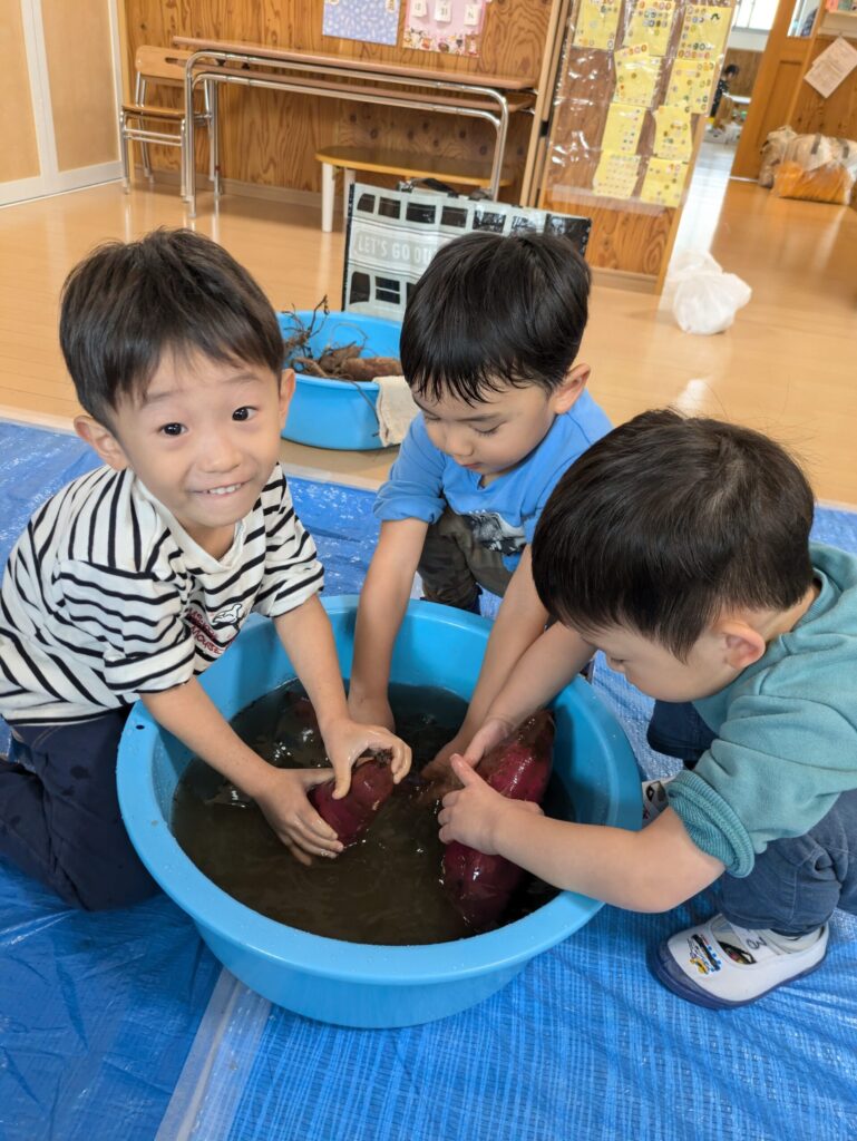 先日4・5歳児さんが芋掘りで収穫してくれたさつまいもを使い、みんなでいもほりごっこを行いました。0歳児さんは土や芋に興味津々!! 1歳児さんも大きなお芋に嬉しそう!!重たいお芋もしっかり収穫してくれました! 2歳児さんも色々な大きさや形のお芋ににっこにこです♪ 3歳児さんも「まだあるかな?」「見て、くっついてるよ」などとお友だちや先生とお話しながら楽しく土を掘っていました。 3歳さんからはみんなが掘ったお芋を洗ってくれました。「こんなに綺麗になったよ」「まだ土ついてる」と丁寧に丁寧に土を落としてくれました(^^)真っ黒になった水に驚きながらも嬉しそうでした。 しっかりと洗ったお芋は4・5歳児さんでアルミホイルに包み、おやつの焼き芋に・・・♡ 「いつもよりおいしい」「これ作ったんだよ」と自分たちで準備したおやつは格別だったようです♪
