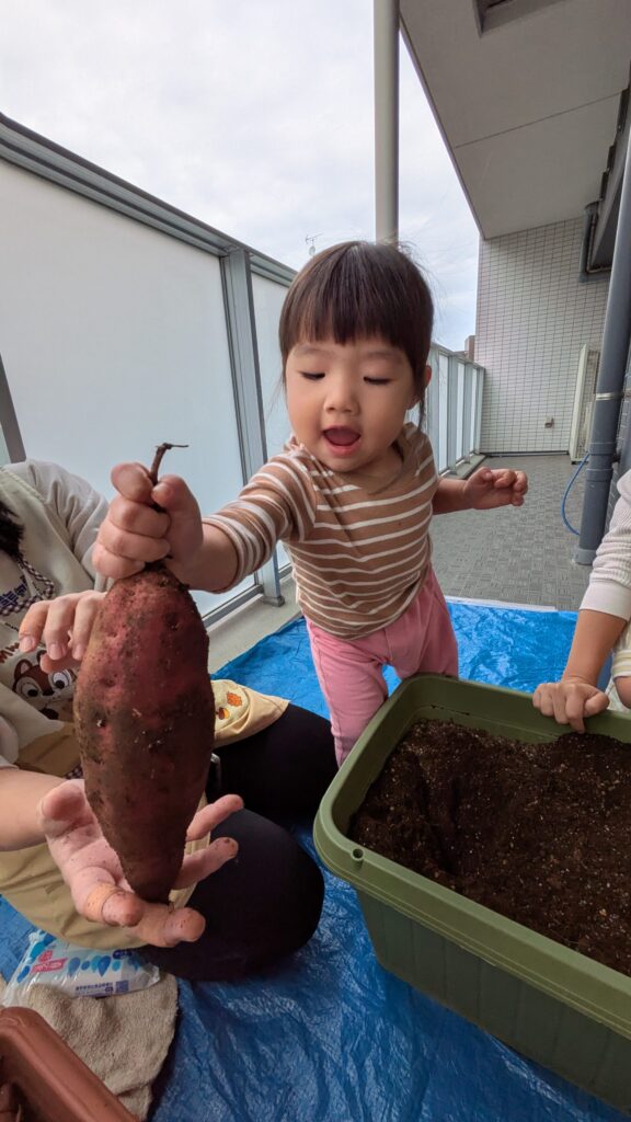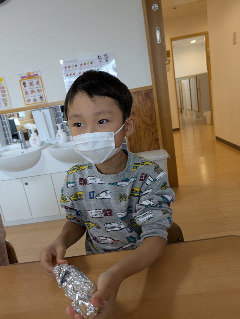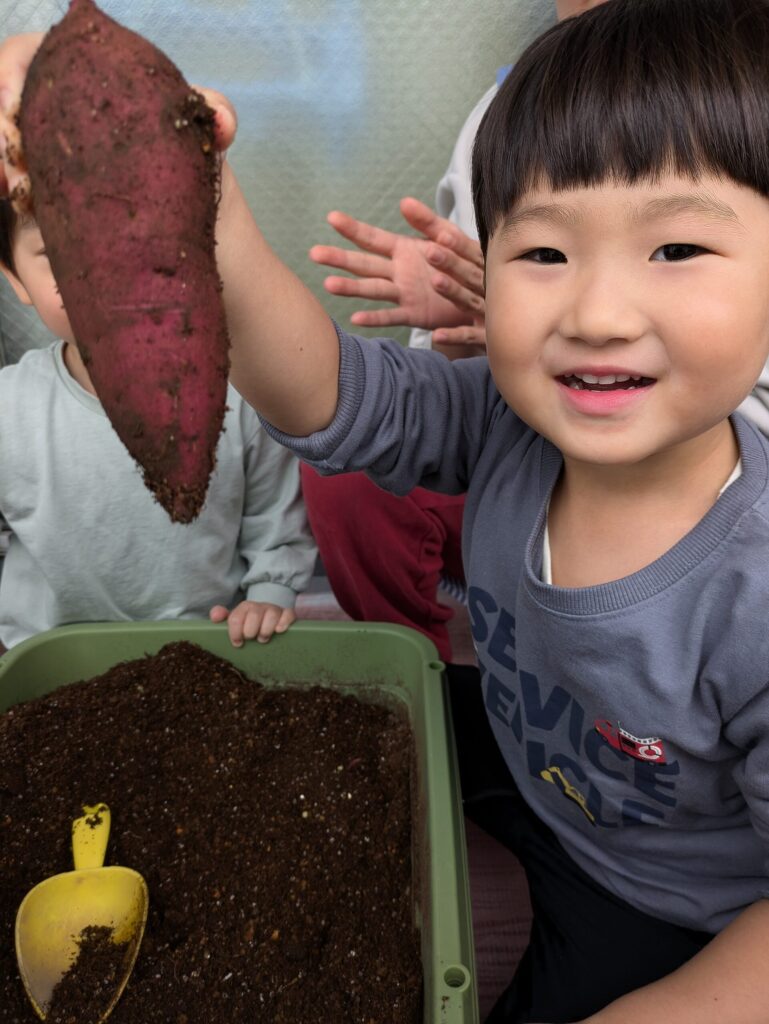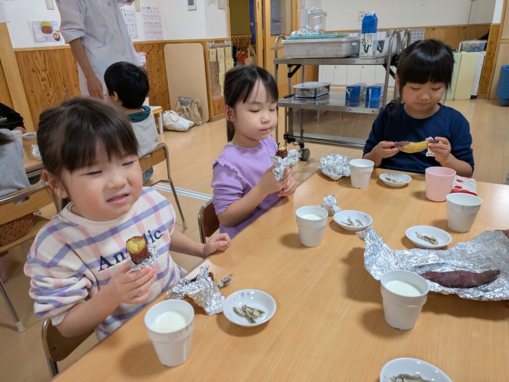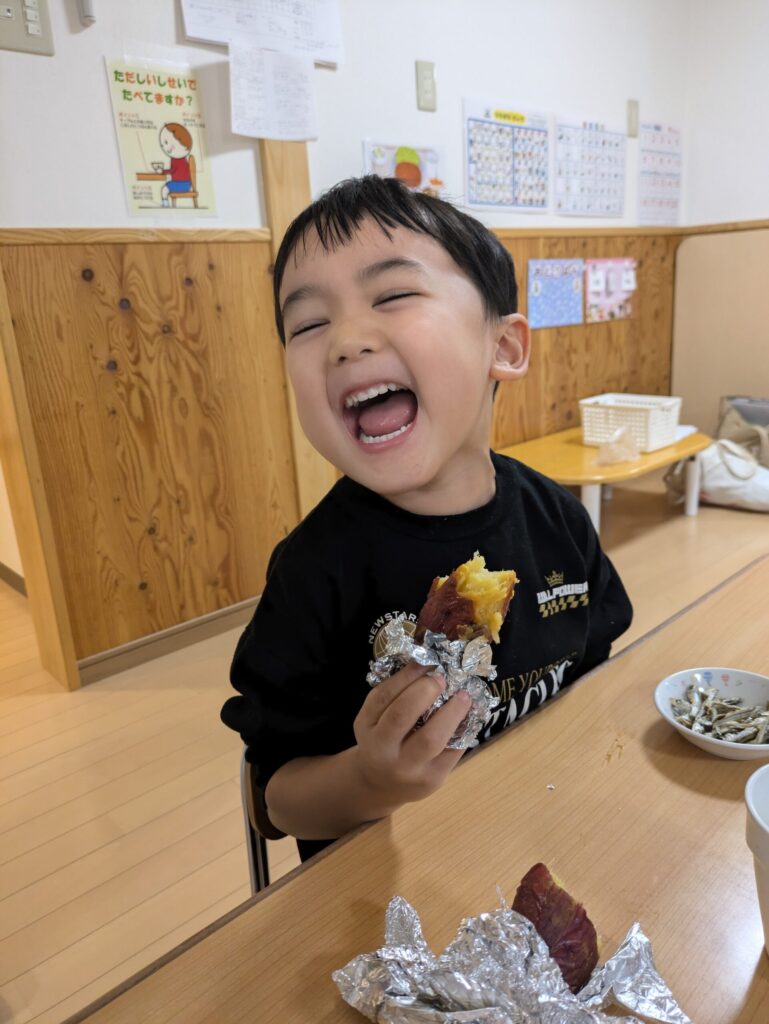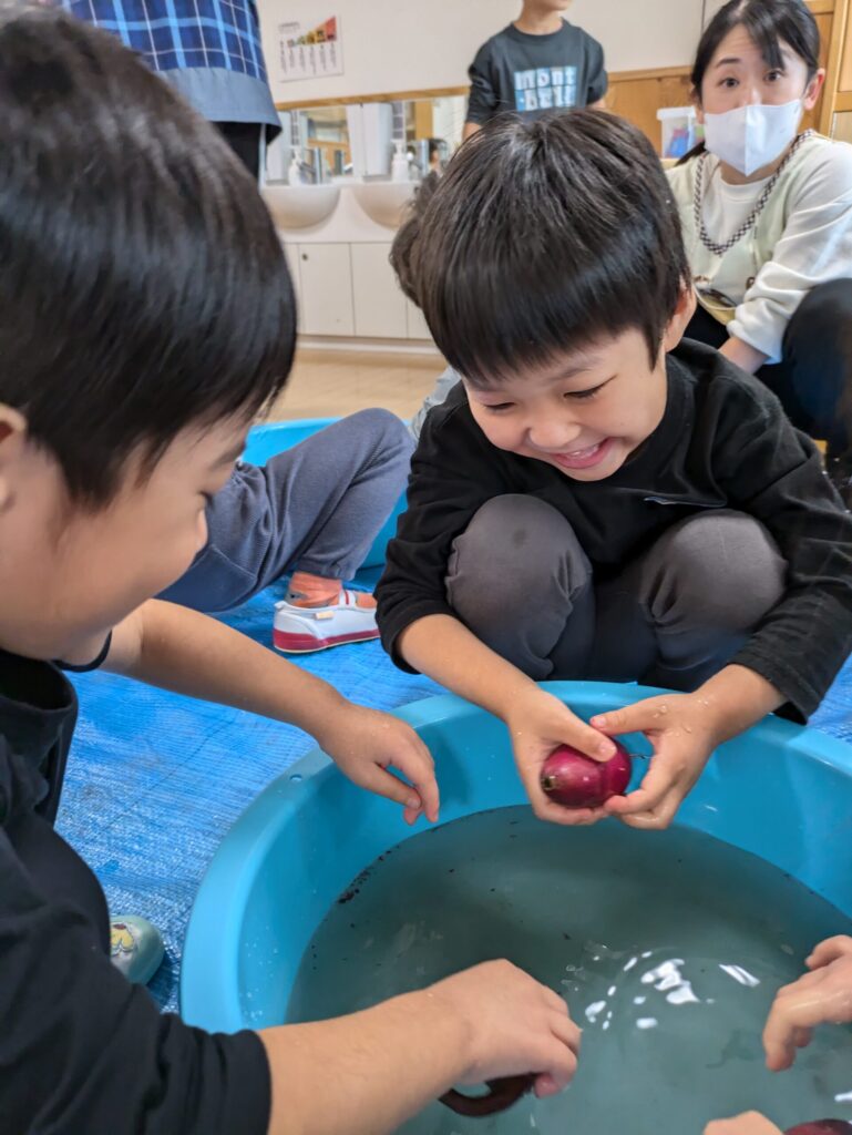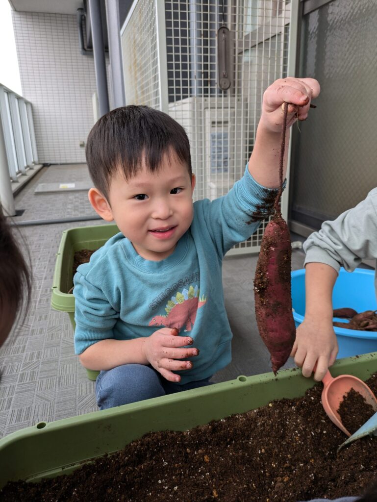 先日4・5歳児さんが芋掘りで収穫してくれたさつまいもを使い、みんなでいもほりごっこを行いました。0歳児さんは土や芋に興味津々!! 1歳児さんも大きなお芋に嬉しそう!!重たいお芋もしっかり収穫してくれました! 2歳児さんも色々な大きさや形のお芋ににっこにこです♪ 3歳児さんも「まだあるかな?」「見て、くっついてるよ」などとお友だちや先生とお話しながら楽しく土を掘っていました。 3歳さんからはみんなが掘ったお芋を洗ってくれました。「こんなに綺麗になったよ」「まだ土ついてる」と丁寧に丁寧に土を落としてくれました(^^)真っ黒になった水に驚きながらも嬉しそうでした。 しっかりと洗ったお芋は4・5歳児さんでアルミホイルに包み、おやつの焼き芋に・・・♡ 「いつもよりおいしい」「これ作ったんだよ」と自分たちで準備したおやつは格別だったようです♪