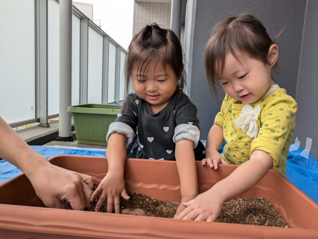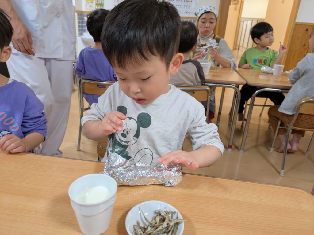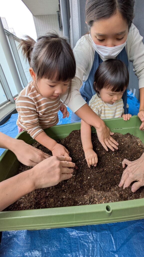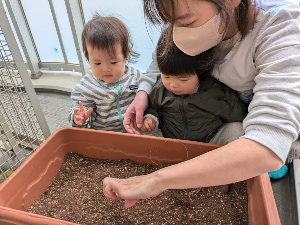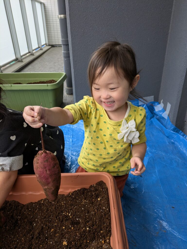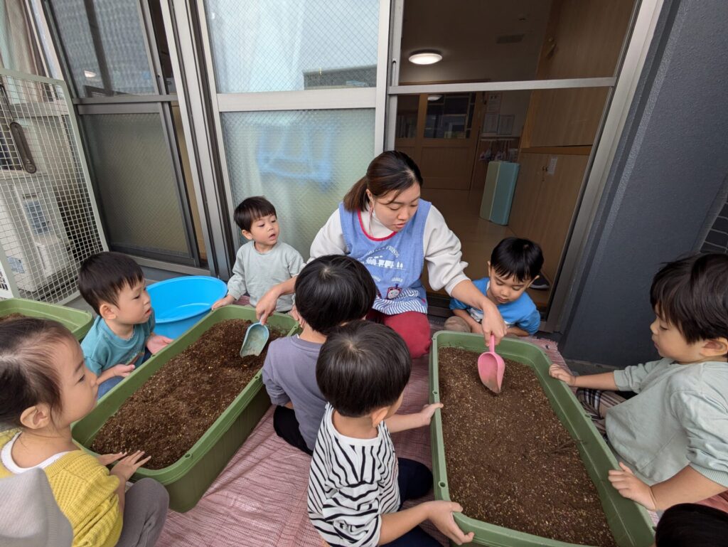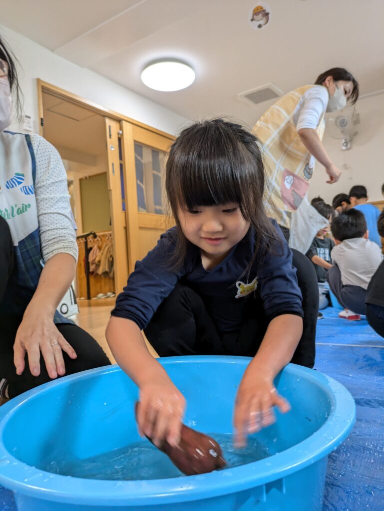 先日4・5歳児さんが芋掘りで収穫してくれたさつまいもを使い、みんなでいもほりごっこを行いました。0歳児さんは土や芋に興味津々!! 1歳児さんも大きなお芋に嬉しそう!!重たいお芋もしっかり収穫してくれました! 2歳児さんも色々な大きさや形のお芋ににっこにこです♪ 3歳児さんも「まだあるかな?」「見て、くっついてるよ」などとお友だちや先生とお話しながら楽しく土を掘っていました。 3歳さんからはみんなが掘ったお芋を洗ってくれました。「こんなに綺麗になったよ」「まだ土ついてる」と丁寧に丁寧に土を落としてくれました(^^)真っ黒になった水に驚きながらも嬉しそうでした。 しっかりと洗ったお芋は4・5歳児さんでアルミホイルに包み、おやつの焼き芋に・・・♡ 「いつもよりおいしい」「これ作ったんだよ」と自分たちで準備したおやつは格別だったようです♪