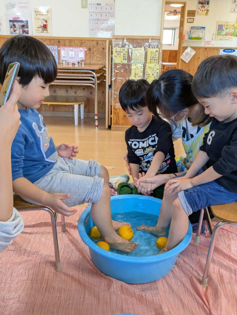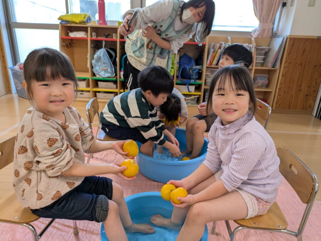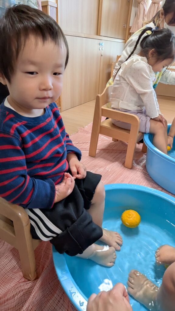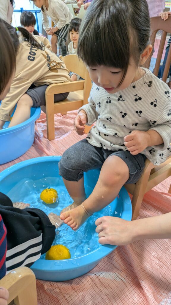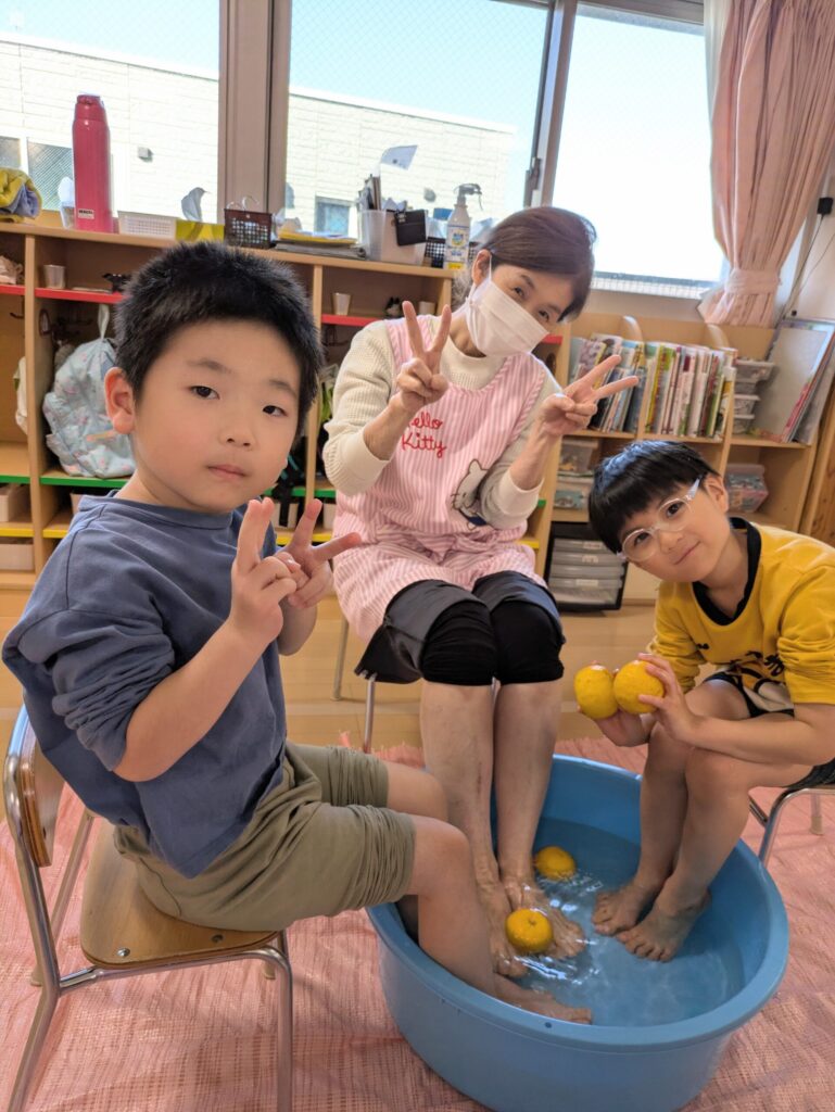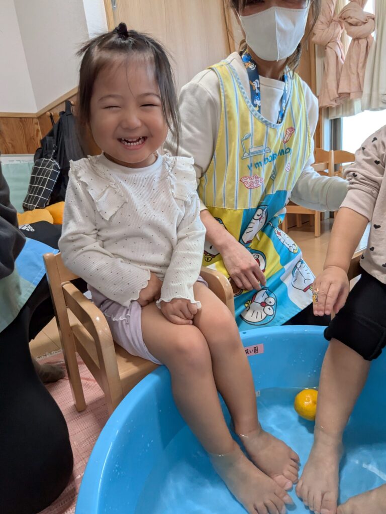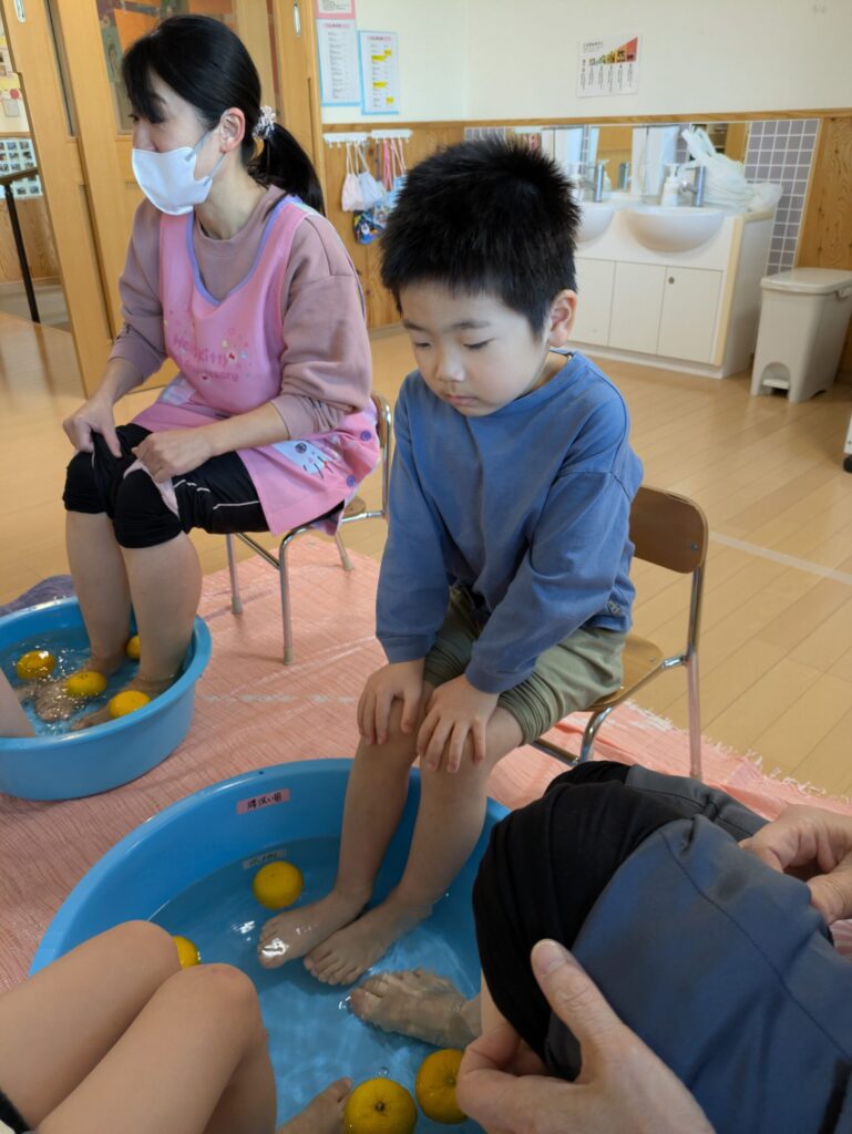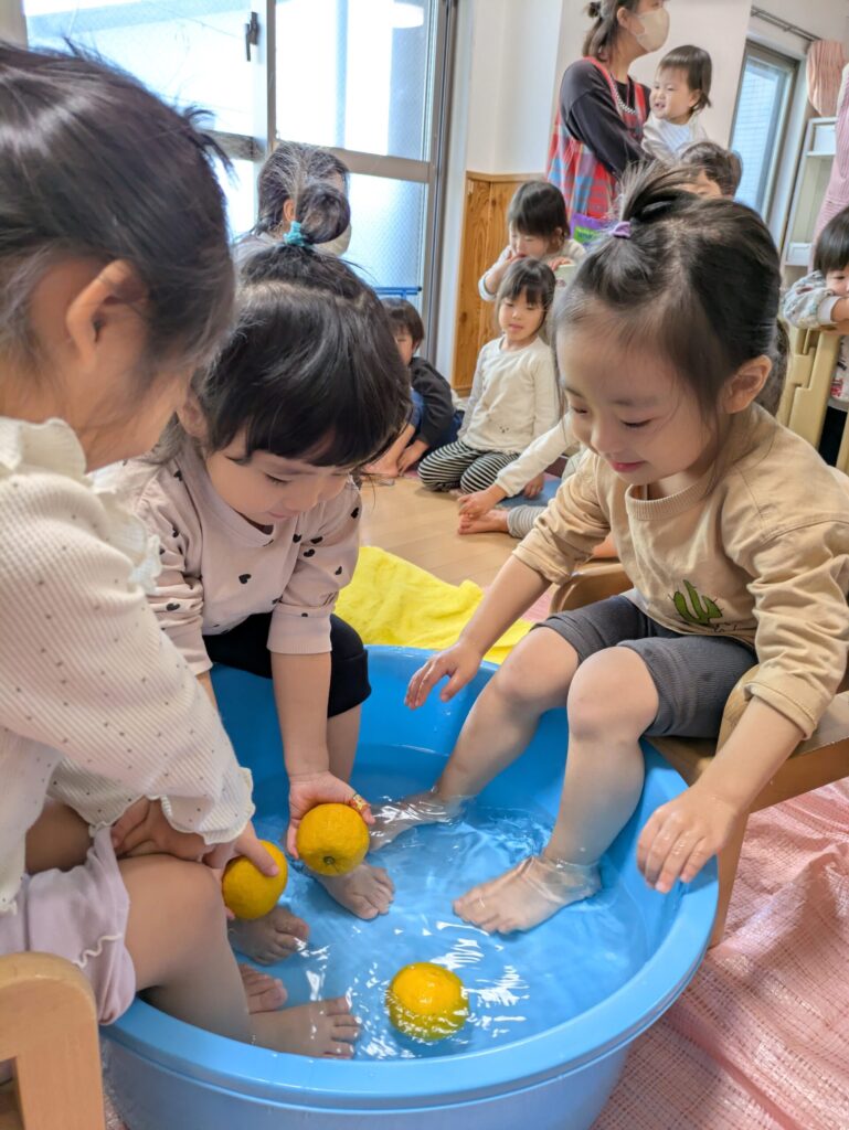 今年の冬至は12月22日!11月の食育は少し早いですが冬至についてです(^^♪冬至の日には、柚子湯に入ったり、「ん」のつく食べ物を食べたりすると縁起が良い、運がつくと言われています! パネルシアターで冬至について紹介。「うどん」「れんこん」「かぼちゃ(なんきん)」「にんじん」「こんにゃく」・・・色々な食べ物が出てきます。 実際に柚子にも触ってみました♪ 小さいお友だちは匂いを嗅いだり、触ったり、お友だちの物と比べっこしたり・・・「すっぱい」「いいにおい」と楽しそうに触れていました。触れた後は、柚子を入れた足湯♨気持ちよさそうな表情がとっても可愛らしかったです♪ 幼児クラスもパネルシアターと柚子湯体験。柚子によって匂いが違うという発見も・・・!!「こっちは甘い」「すっぱいかも」と些細な違いに気付いていました。 柚子湯も「あったかい」「気持ちいいね」「先生も入ってもいいよ」と嬉しそうに周りに声を掛けてくれました(^^)♪ お家でも冬至の日(12月22日)には、「ん」のつく食べ物や柚子湯、ぜひ体験してみてください☆