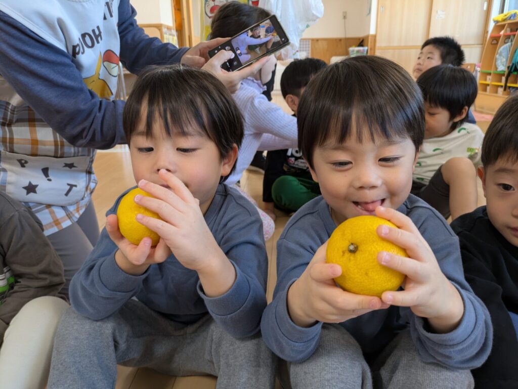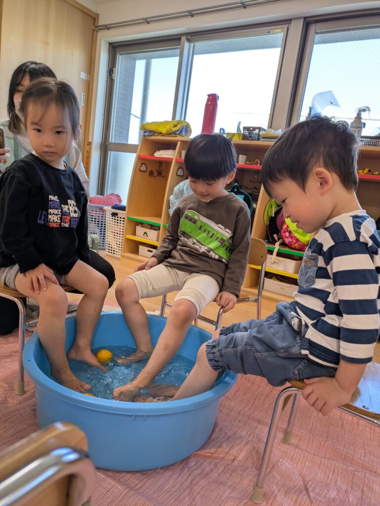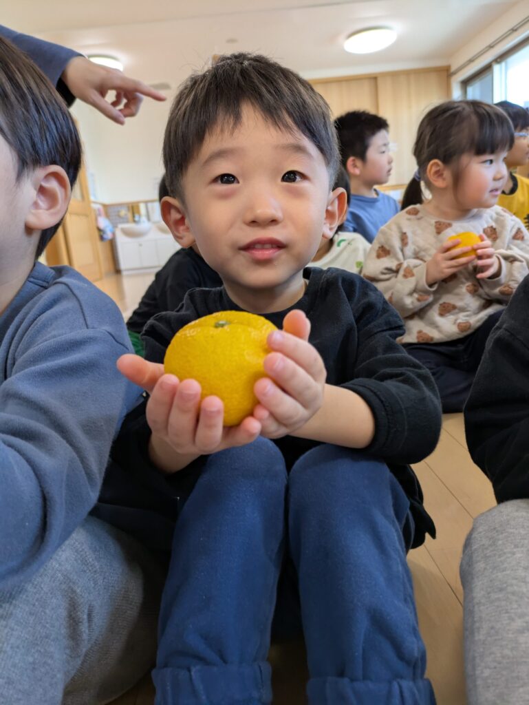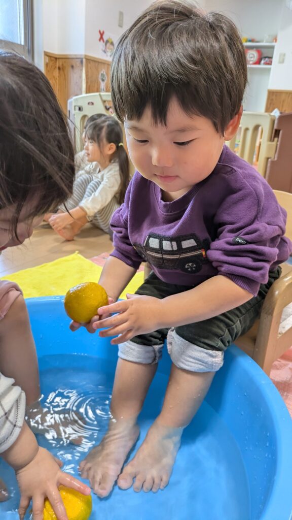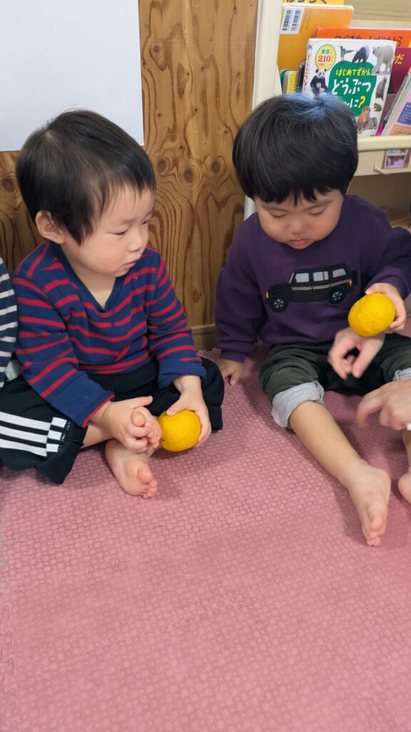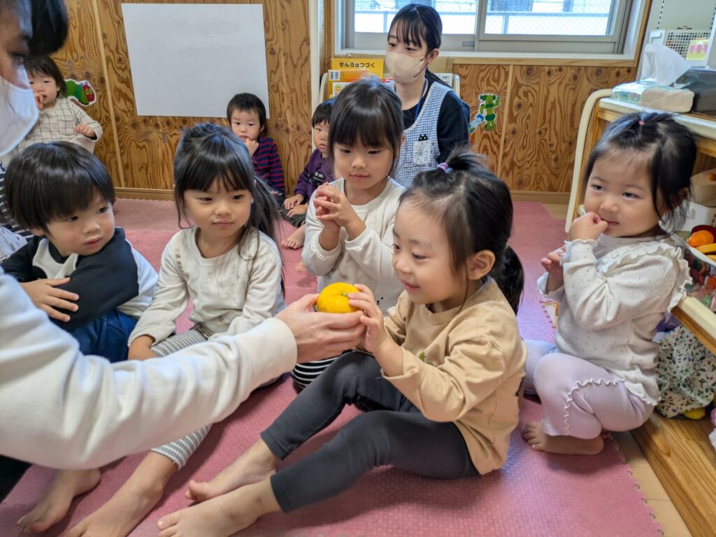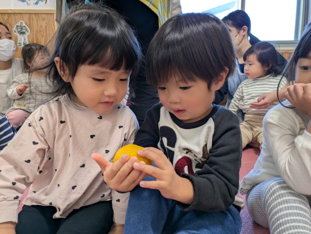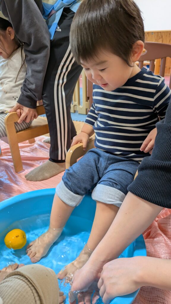今年の冬至は12月22日!11月の食育は少し早いですが冬至についてです(^^♪冬至の日には、柚子湯に入ったり、「ん」のつく食べ物を食べたりすると縁起が良い、運がつくと言われています! パネルシアターで冬至について紹介。「うどん」「れんこん」「かぼちゃ(なんきん)」「にんじん」「こんにゃく」・・・色々な食べ物が出てきます。 実際に柚子にも触ってみました♪ 小さいお友だちは匂いを嗅いだり、触ったり、お友だちの物と比べっこしたり・・・「すっぱい」「いいにおい」と楽しそうに触れていました。触れた後は、柚子を入れた足湯♨気持ちよさそうな表情がとっても可愛らしかったです♪ 幼児クラスもパネルシアターと柚子湯体験。柚子によって匂いが違うという発見も・・・!!「こっちは甘い」「すっぱいかも」と些細な違いに気付いていました。 柚子湯も「あったかい」「気持ちいいね」「先生も入ってもいいよ」と嬉しそうに周りに声を掛けてくれました(^^)♪ お家でも冬至の日(12月22日)には、「ん」のつく食べ物や柚子湯、ぜひ体験してみてください☆