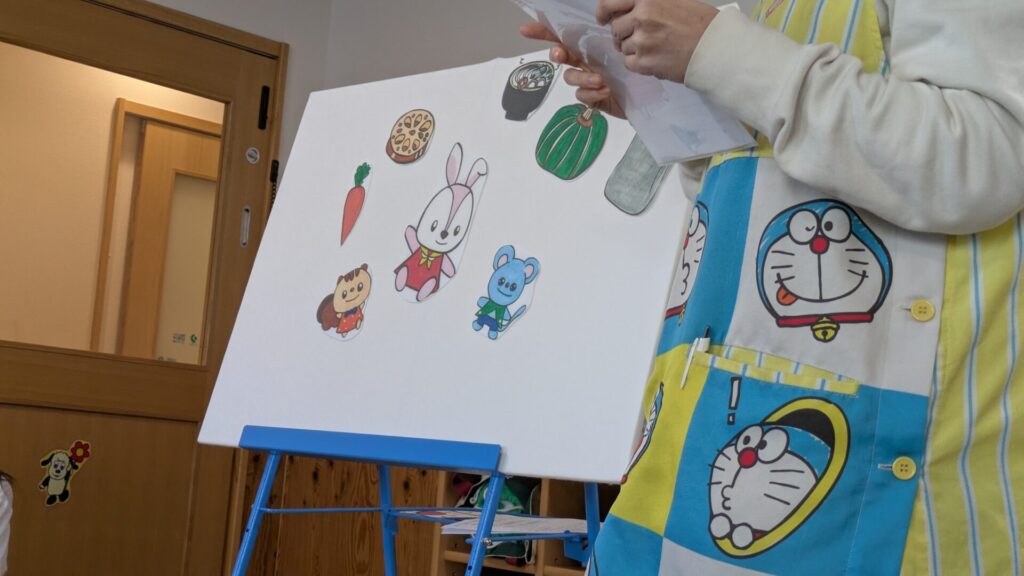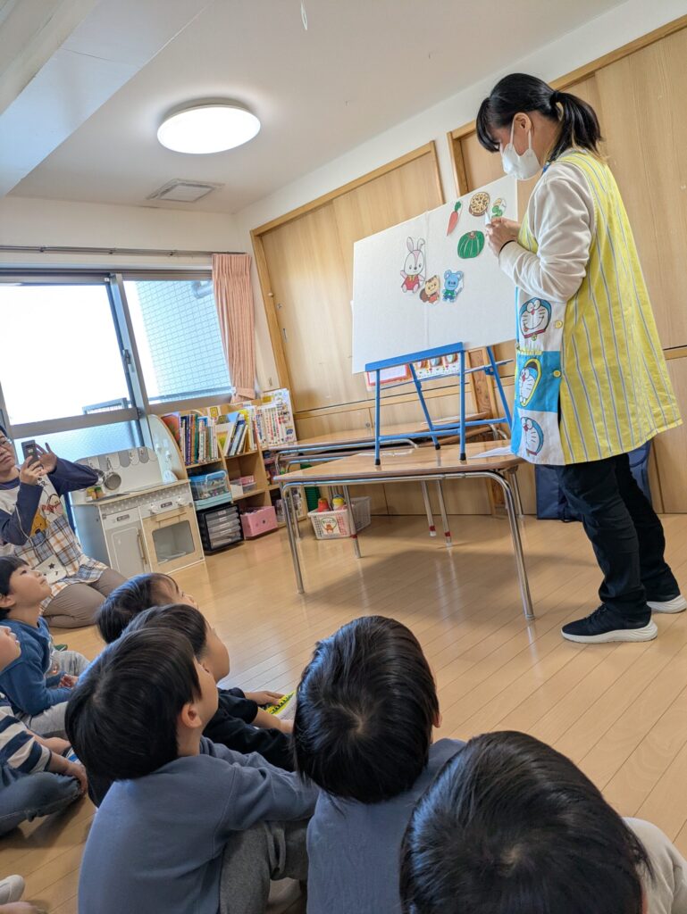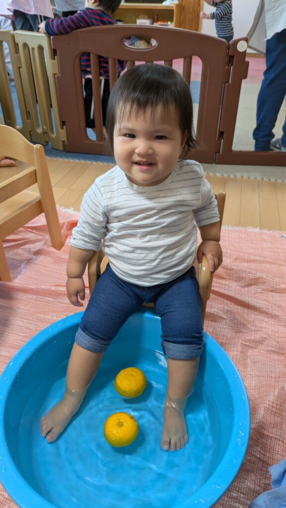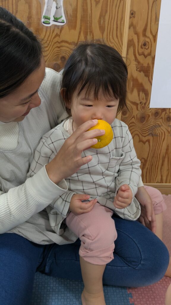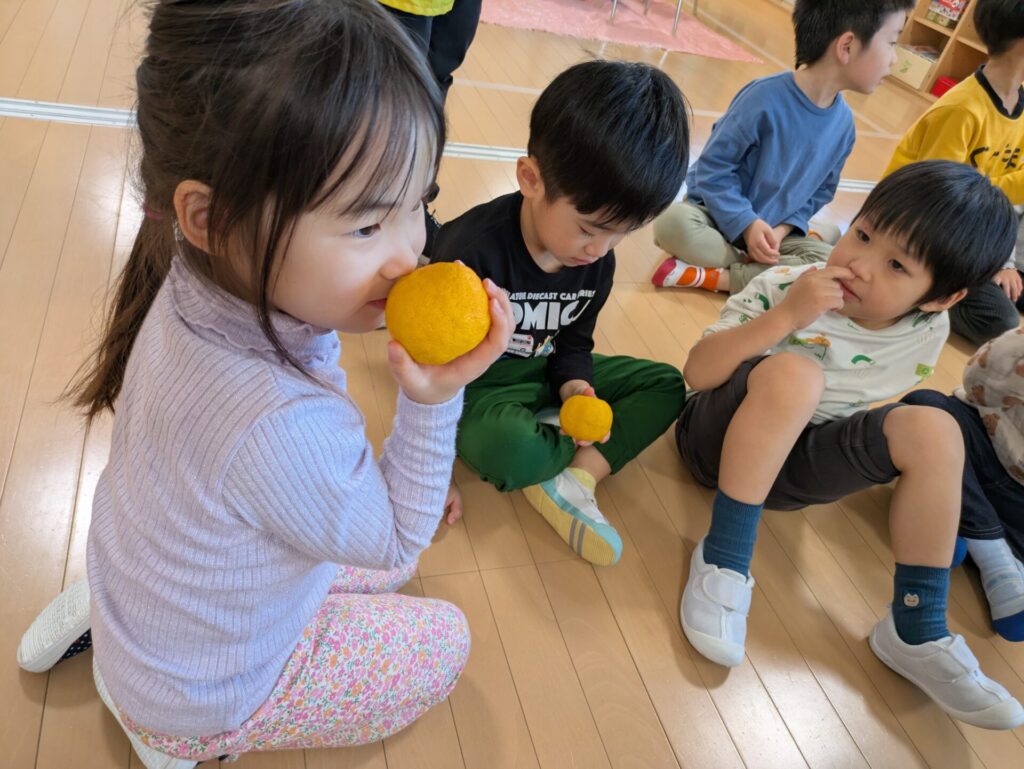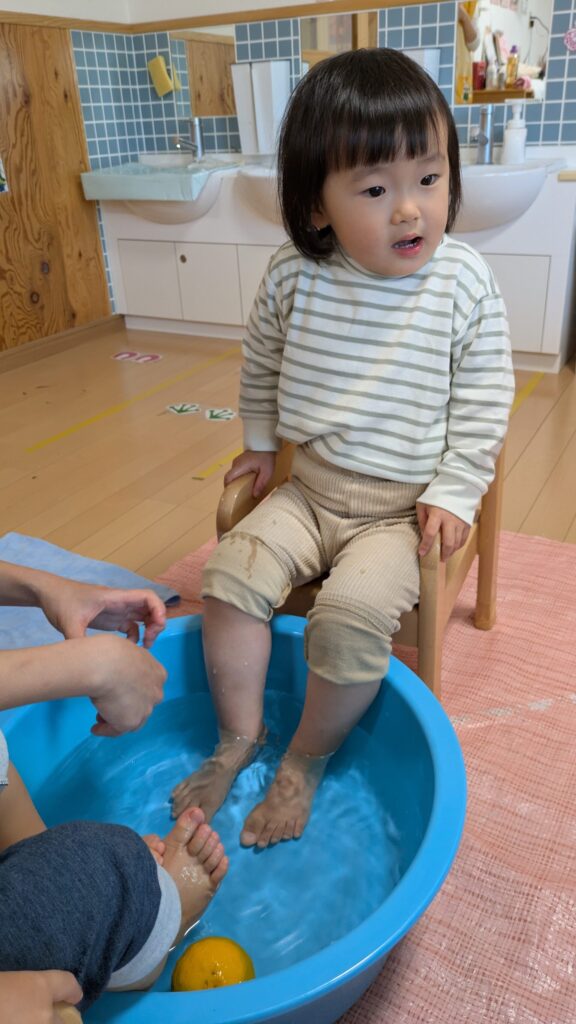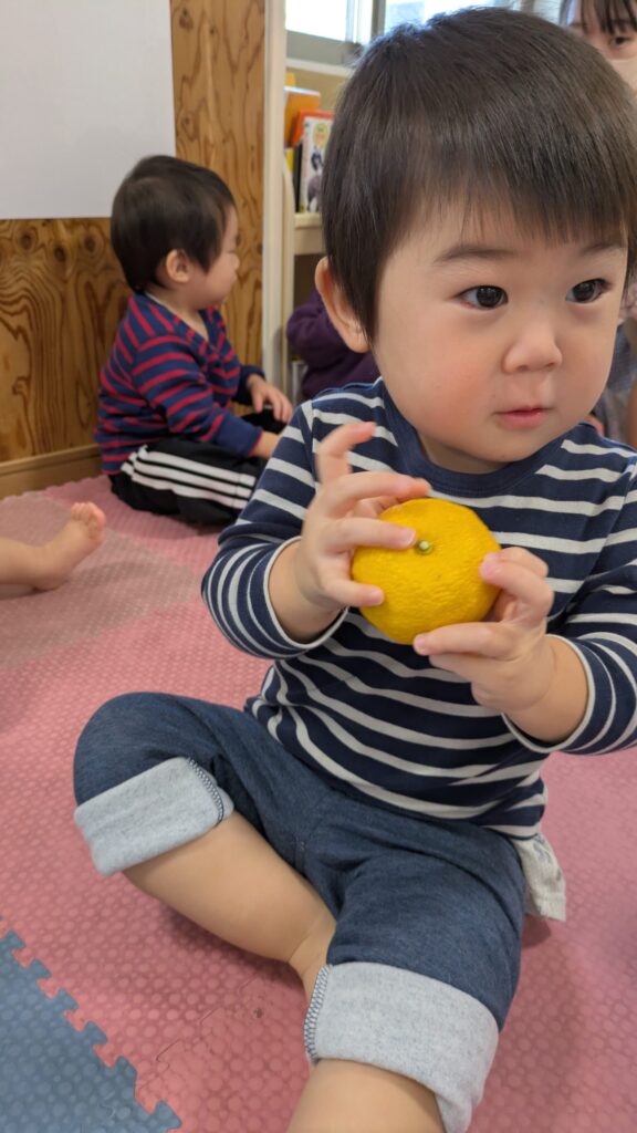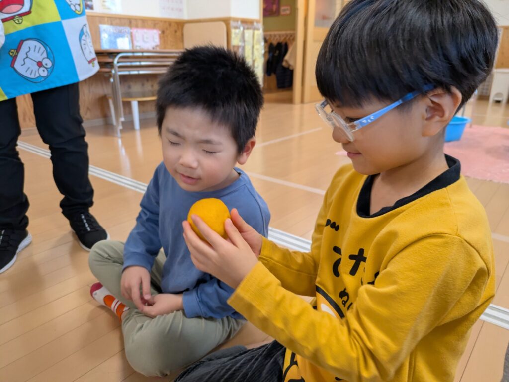 今年の冬至は12月22日!11月の食育は少し早いですが冬至についてです(^^♪冬至の日には、柚子湯に入ったり、「ん」のつく食べ物を食べたりすると縁起が良い、運がつくと言われています! パネルシアターで冬至について紹介。「うどん」「れんこん」「かぼちゃ(なんきん)」「にんじん」「こんにゃく」・・・色々な食べ物が出てきます。 実際に柚子にも触ってみました♪ 小さいお友だちは匂いを嗅いだり、触ったり、お友だちの物と比べっこしたり・・・「すっぱい」「いいにおい」と楽しそうに触れていました。触れた後は、柚子を入れた足湯♨気持ちよさそうな表情がとっても可愛らしかったです♪ 幼児クラスもパネルシアターと柚子湯体験。柚子によって匂いが違うという発見も・・・!!「こっちは甘い」「すっぱいかも」と些細な違いに気付いていました。 柚子湯も「あったかい」「気持ちいいね」「先生も入ってもいいよ」と嬉しそうに周りに声を掛けてくれました(^^)♪ お家でも冬至の日(12月22日)には、「ん」のつく食べ物や柚子湯、ぜひ体験してみてください☆